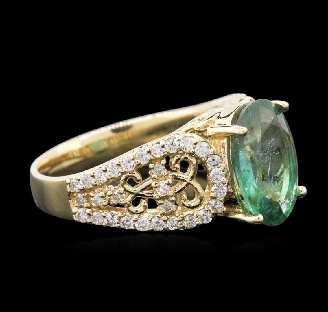One electronically tested 14KT yellow gold ladies cast emerald and diamond ring with a bright polish finish. Identified with markings of "K14". Condition is new. Containing: One prong set oval modified brilliant cut natural emerald, measuring 11.43 x 8.70 x 4.35mm, approximate weight of 2.47ct., clarity is slightly included, type III, light, very slightly grayish, green color, (GIA G 3/3), cut is good. Fifty-Eight prong set round brilliant cut diamonds, measuring 1.30 - 1.30 x 0.78mm (depth est.) approximate total weight of 58 Stones = 0.46ct. Clarity: SI-2 to I-1. Color: K, Cut is Good. Colored gemstones are presumed to have been subjected to commonly used enhancement processes. All diamonds and colored gemstones are graded in the mounting, unless otherwise stated. Total Weight of Colored Stones 2.47ct. Total Weight of Diamonds 0.46ct. Total Weight of Ring 5.50 grams. GGL Appraised at $4,475.00.