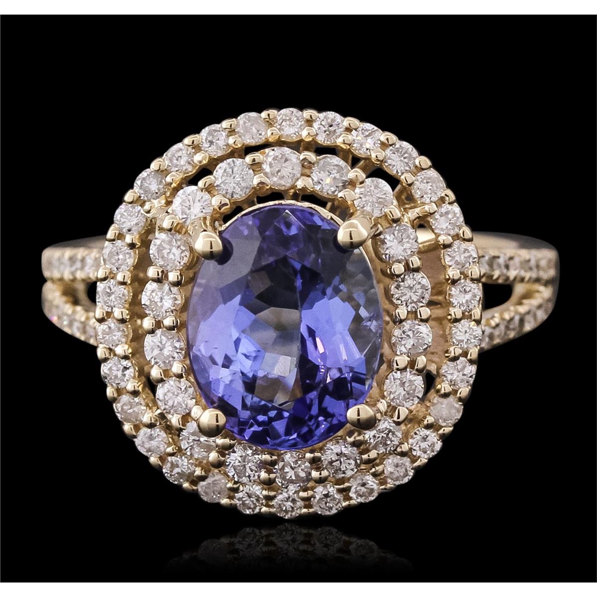 One electronically tested 14KT yellow gold ladies combination cast & assembled tanzanite and diamond ring with a split shank with a bright polish finish. Identified with markings of "14K". Condition is new. Containing: One prong set oval modified brilliant cut natural tanzanite, measuring 9.64 x 7.62 x 4.95mm, approximate weight of 2.47ct., clarity is eye clean, type I, medium, moderately strong, bluish violet color, (GIA bV 5/4), cut is good. Seventy-Six prong set round brilliant cut diamonds, measuring 1.30 - 1.10 x 0.72mm (depth est.) approximate total weight of 76 Stones = 0.48ct. Clarity: I-1 to I-2. Color: J - K, Cut is Good. Colored gemstones are presumed to have been subjected to commonly used enhancement processes. All diamonds and colored gemstones are graded in the mounting, unless otherwise stated total weight of Colored Stones 2.47ct. Total Weight of Diamonds 0.48ct. Total Weight of Ring 5.60 grams. GGL Appraised at $6,805.00.