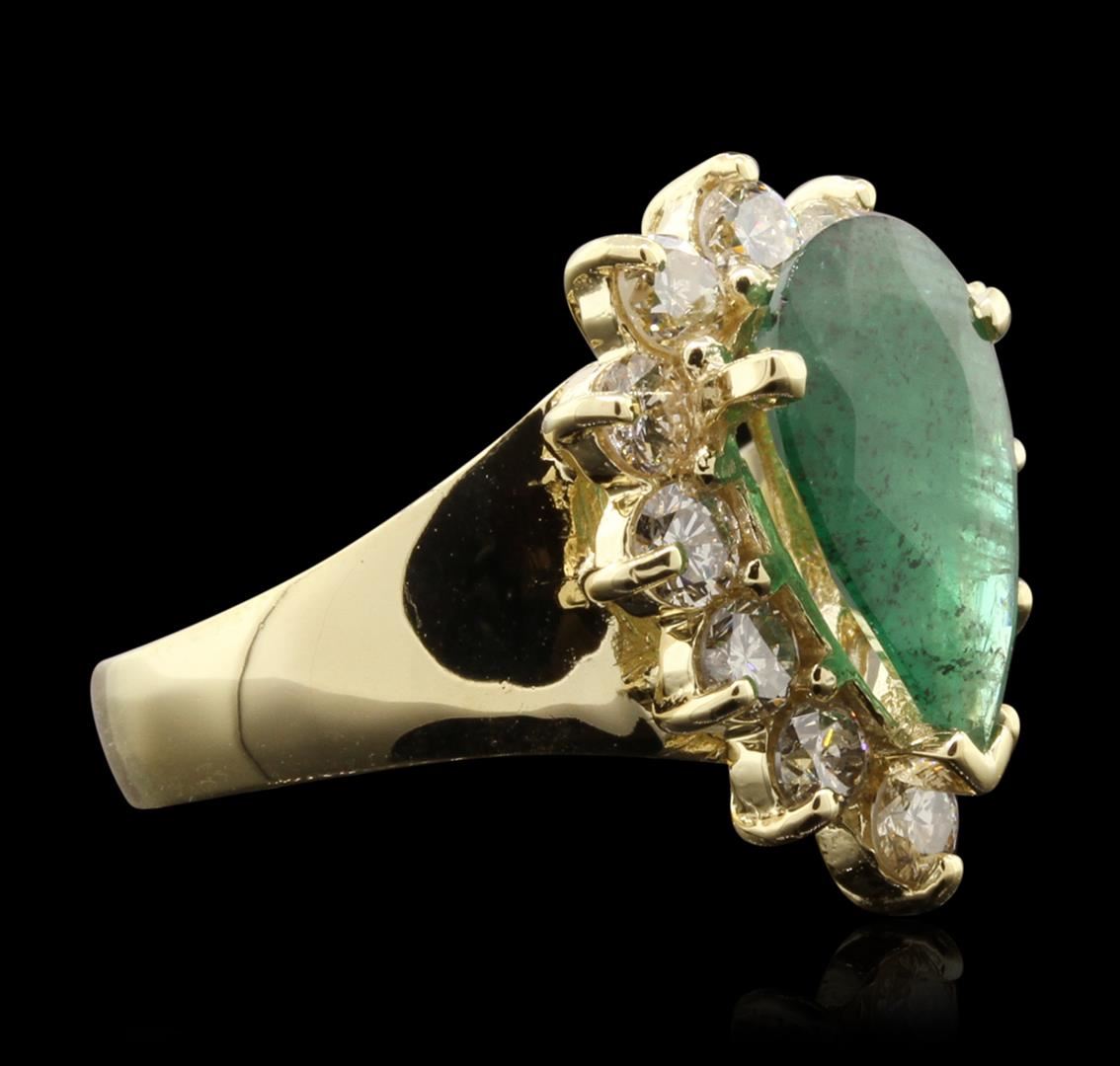 One electronically tested 14KT yellow gold ladies cast emerald and diamond ring with a bright polish finish. The featured emerald is set within a diamond bezel, completed by a three and one-half wide band. Identified with markings of "K14". Condition is new, good workmanship. Containing: One prong set pear mixed cut natural emerald, measuring 13.20 x 8.00 x 4.00mm, 8%. bulge factor, approximate weight of 2.48ct., clarity is heavily included, type III, medium, very slightly grayish, very slightly bluish green color, (GIA vslbG 5/3), cut is good. Transmitting light with a minimum of distortion, transparent to translucent. Naturally occurring internal & external characteristics are present. Indications of oil residue. Graded in the setting. Twelve prong set round brilliant cut diamonds, measuring 3.10 - 3.00 x 1.83mm (depth est.) approximate. Total Weight of 12 Stones = 1.34ct. Graded in the setting. Clarity: SI-2 to I-1 . Color: J - K. Total Weight of Colored Stones 2.48ct. Total Weight of Diamonds 1.34ct. AIG Appraised at $6,400.00.