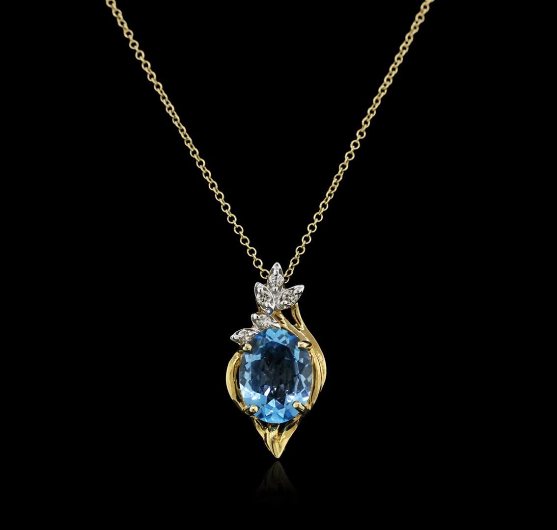 One pendant with chain featuring: 14KT yellow gold weighing 1.90 grams containing one blue topaz center stone with a total weight of 2.48ct and diamonds with a total weight of 0.10ct.