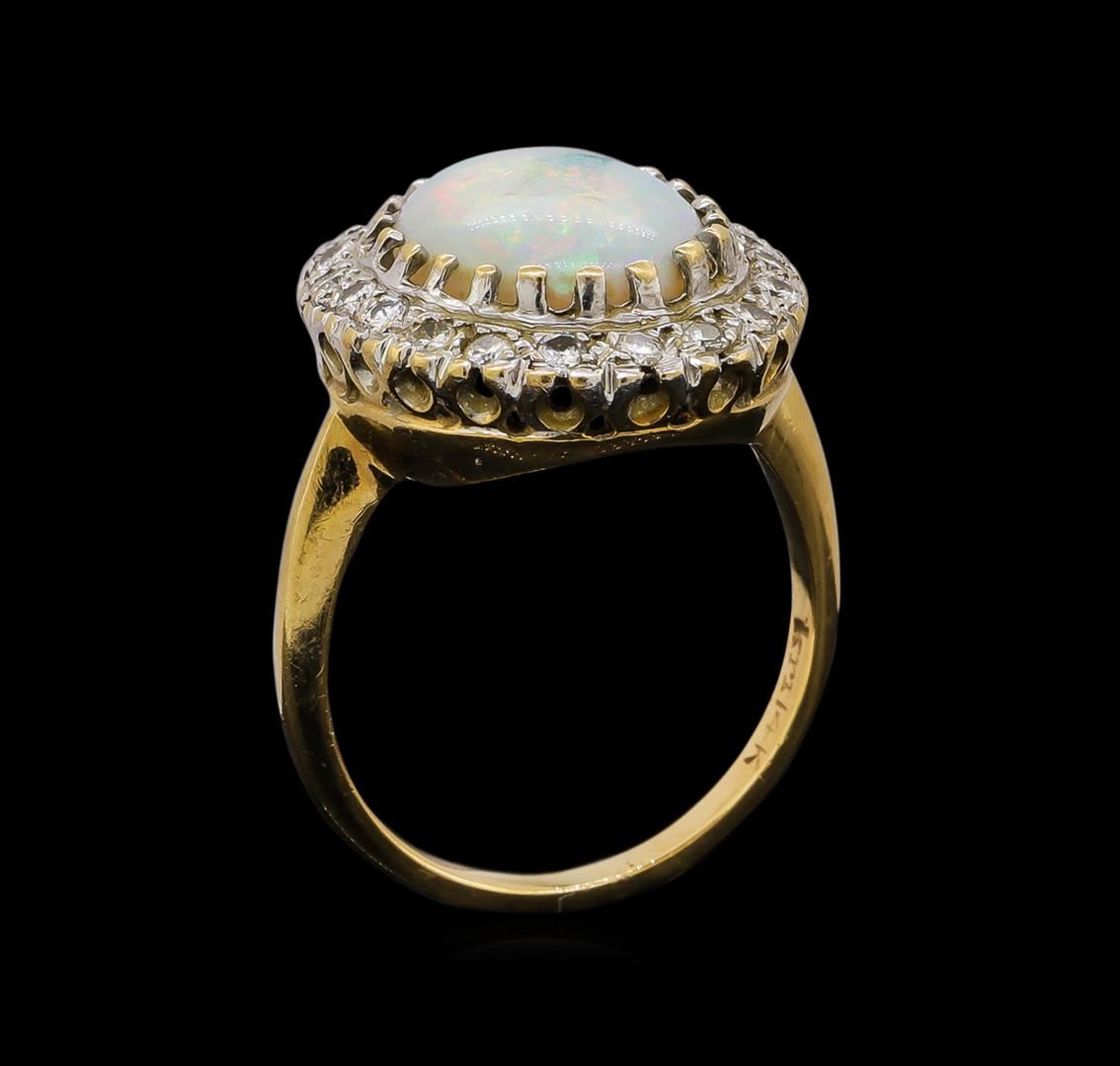 One electronically tested 14KT yellow gold ladies cast opal and diamond ring. The featured opal is set within a diamond bezel, completed by a one and one-half millimeter wide band. Bright polish finish with rhodium accents. Identified with markings of "14K". Condition is good. Containing: One crystal opal that is cut in a oval shaped cabochon and is prong set, measuring 12.00 mm long x 9.34 mm wide, and 3.55 mm thick and the approximate weight is 2.50 carats. The opal has a somewhat bright, multicolor play of color (fire) in a flashfire pattern; a medium dome; a good cut; slightly included; minor dull spot in its brightness and pattern; and is somewhat directional. Graded in the setting. Twenty prong set round brilliant cut diamonds, measuring 1.60 - 1.50 x 0.93mm (depth est.) approximate total weight of 20 Stones = 0.38ct. Graded in the setting. Clarity: VS-1 to VS-2. Color: G - I. Total Weight of Diamonds 0.38ct. Total Weight of Opals 2.50ct. Total Weight of Ring 6.06 grams. AIG Appraised at $3,050.00.