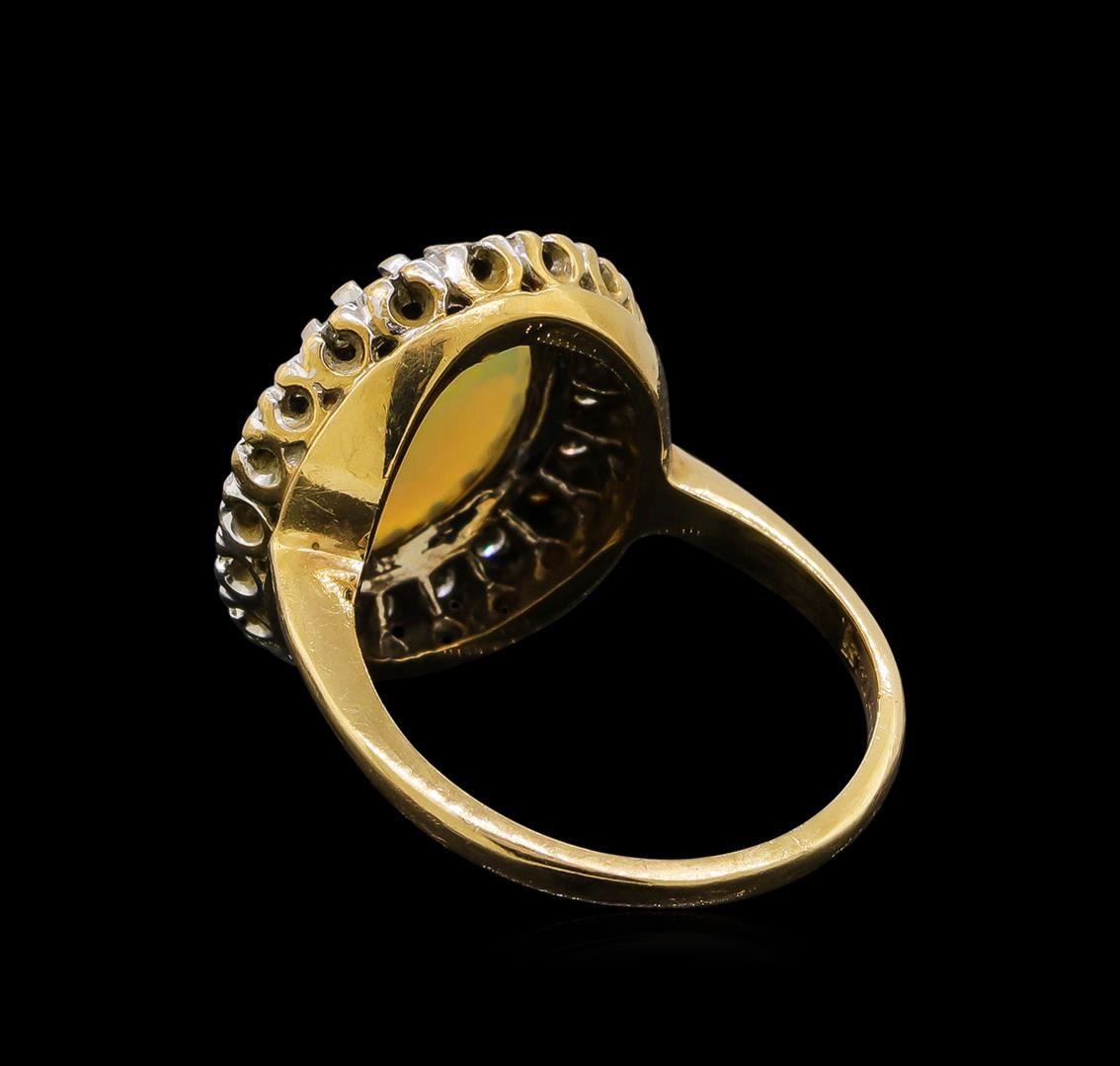One electronically tested 14KT yellow gold ladies cast opal and diamond ring. The featured opal is set within a diamond bezel, completed by a one and one-half millimeter wide band. Bright polish finish with rhodium accents. Identified with markings of "14K". Condition is good. Containing: One crystal opal that is cut in a oval shaped cabochon and is prong set, measuring 12.00 mm long x 9.34 mm wide, and 3.55 mm thick and the approximate weight is 2.50 carats. The opal has a somewhat bright, multicolor play of color (fire) in a flashfire pattern; a medium dome; a good cut; slightly included; minor dull spot in its brightness and pattern; and is somewhat directional. Graded in the setting. Twenty prong set round brilliant cut diamonds, measuring 1.60 - 1.50 x 0.93mm (depth est.) approximate total weight of 20 Stones = 0.38ct. Graded in the setting. Clarity: VS-1 to VS-2. Color: G - I. Total Weight of Diamonds 0.38ct. Total Weight of Opals 2.50ct. Total Weight of Ring 6.06 grams. AIG Appraised at $3,050.00.