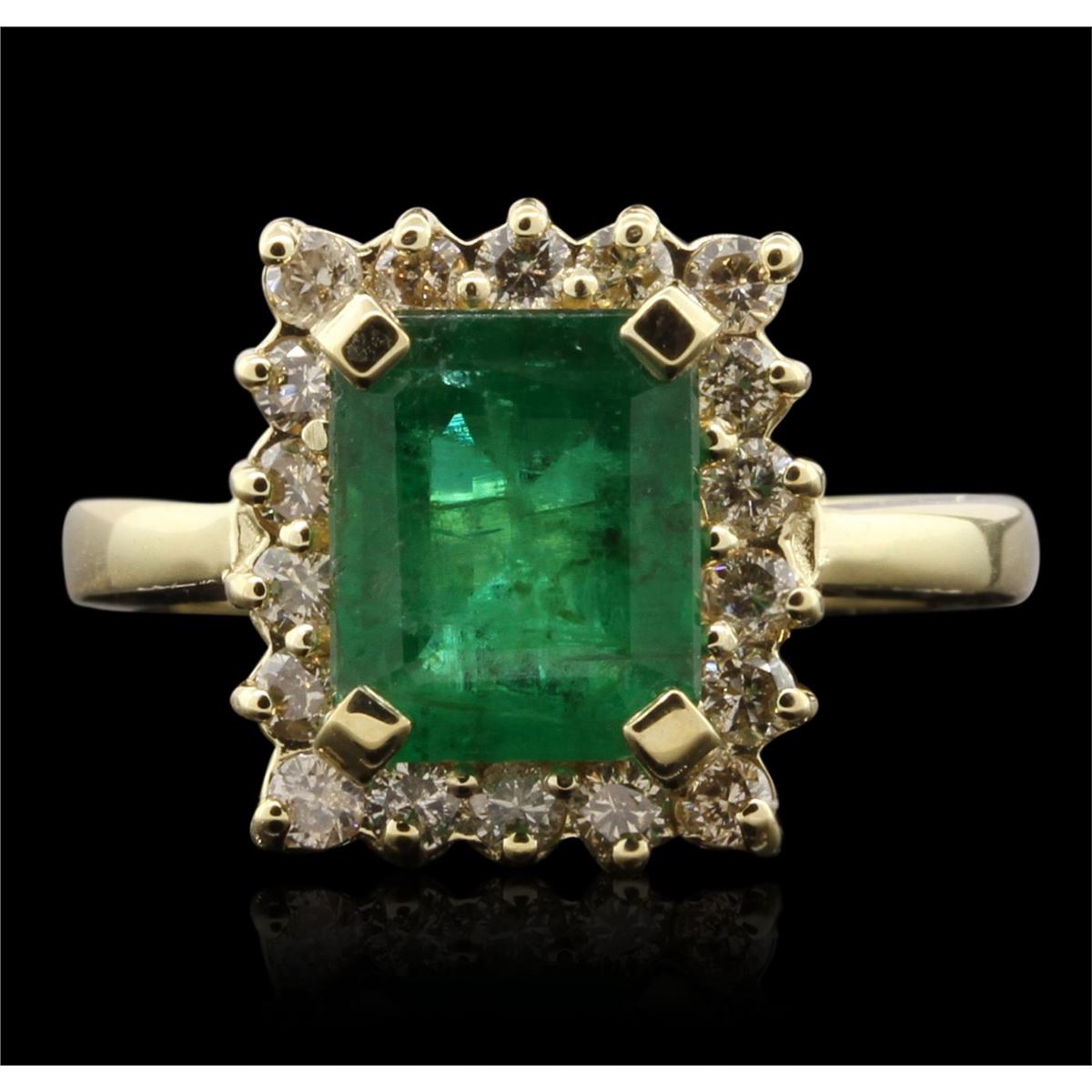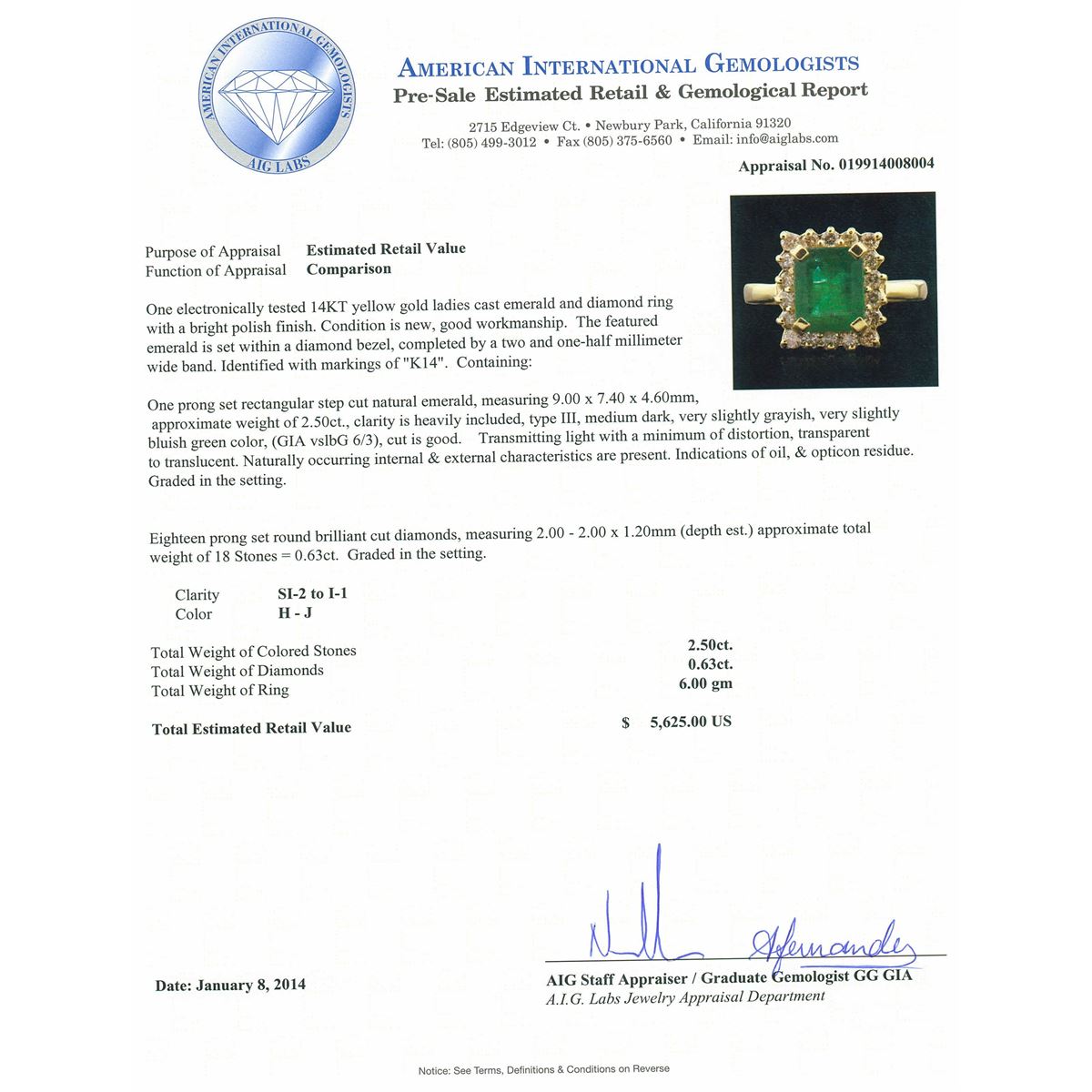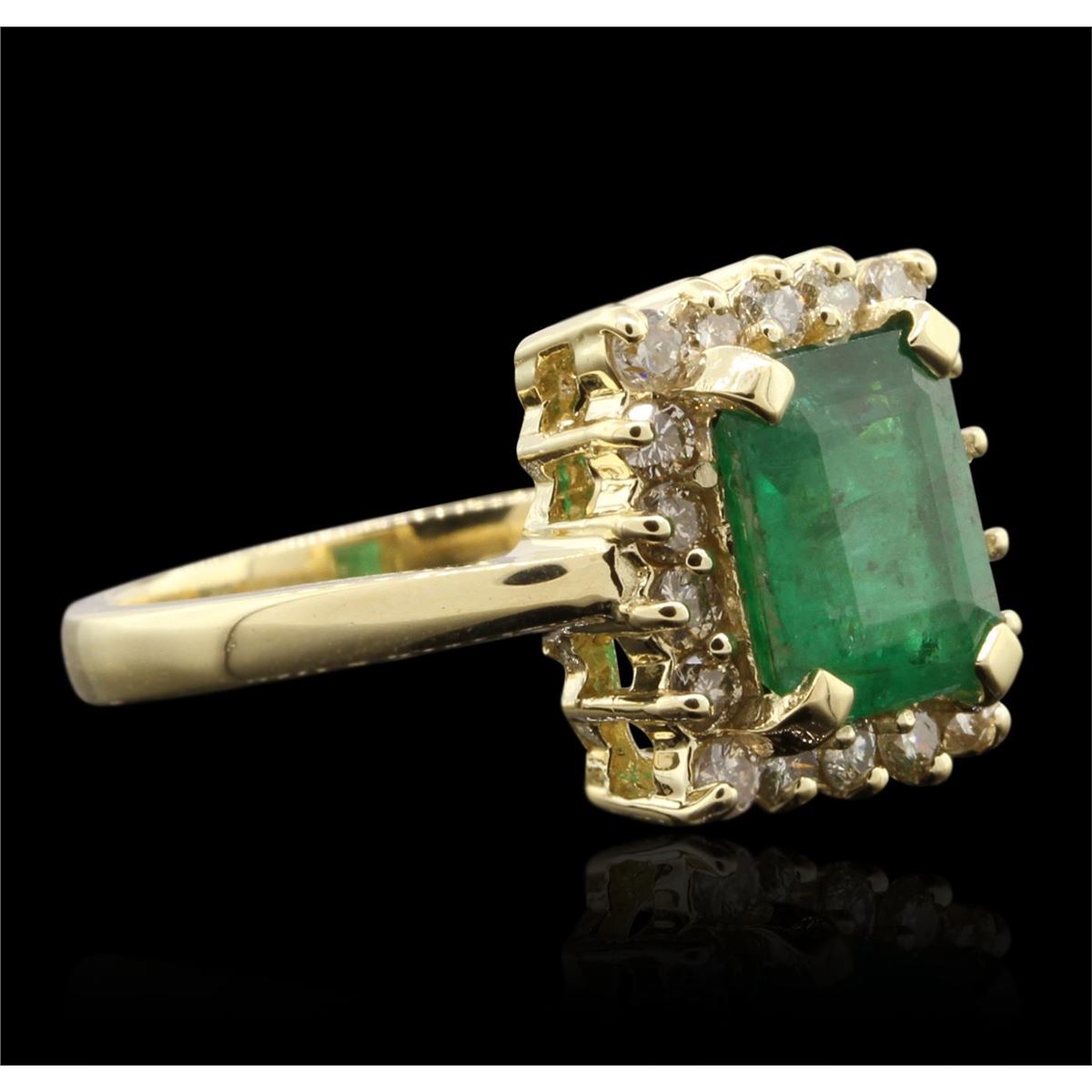 One electronically tested 14KT yellow gold ladies cast emerald and diamond ring with a bright polish finish. The featured emerald is set within a diamond bezel, completed by a two and one-half millimeter wide band. Identified with markings of "K14". Condition is new, good workmanship. Containing: One prong set rectangular step cut natural emerald, measuring 9.00 x 7.40 x 4.60mm, approximate weight of 2.50ct., clarity is heavily included, type III, medium dark, very slightly grayish, very slightly bluish green color, (GIA vslbG 6/3), cut is good. Transmitting light with a minimum of distortion, transparent to translucent. Naturally occurring internal & external characteristics are present. Indications of oil, & opticon residue. Graded in the setting. Eighteen prong set round brilliant cut diamonds, measuring 2.00 - 2.00 x 1.20mm (depth est.) approximate. Total Weight of 18 Stones = 0.63ct. Graded in the setting. Clarity: SI-2 to I-1 . Color: H - J. Total Weight of Colored Stones 2.50ct. Total Weight of Diamonds 0.63ct. AIG Appraised at $5,625.00.