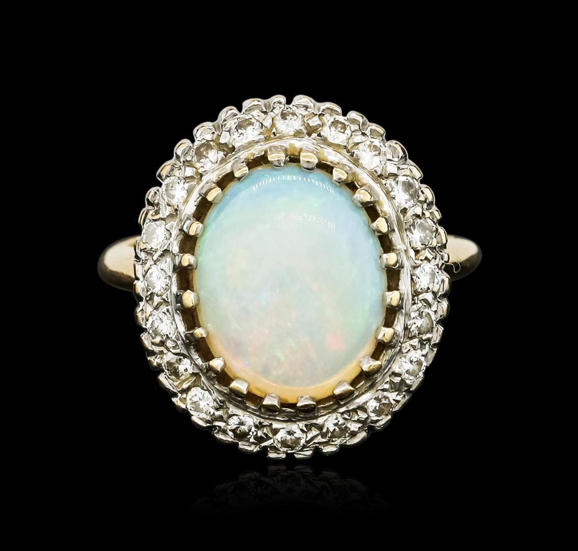 One electronically tested 14KT yellow gold ladies cast opal and diamond ring. The featured opal is set within a diamond bezel, completed by a one and one-half millimeter wide band. Bright polish finish with rhodium accents. Identified with markings of "14K". Condition is good. Containing: One crystal opal that is cut in a oval shaped cabochon and is prong set, measuring 12.00 mm long x 9.34 mm wide, and 3.55 mm thick and the approximate weight is 2.50 carats. The opal has a somewhat bright, multicolor play of color (fire) in a flashfire pattern; a medium dome; a good cut; slightly included; minor dull spot in its brightness and pattern; and is somewhat directional. Graded in the setting. Twenty prong set round brilliant cut diamonds, measuring 1.60 - 1.50 x 0.93mm (depth est.) approximate total weight of 20 Stones = 0.38ct. Graded in the setting. Clarity: VS-1 to VS-2. Color: G - I. Total Weight of Diamonds 0.38ct. Total Weight of Opals 2.50ct. Total Weight of Ring 6.06 grams. AIG Appraised at $3,050.00.