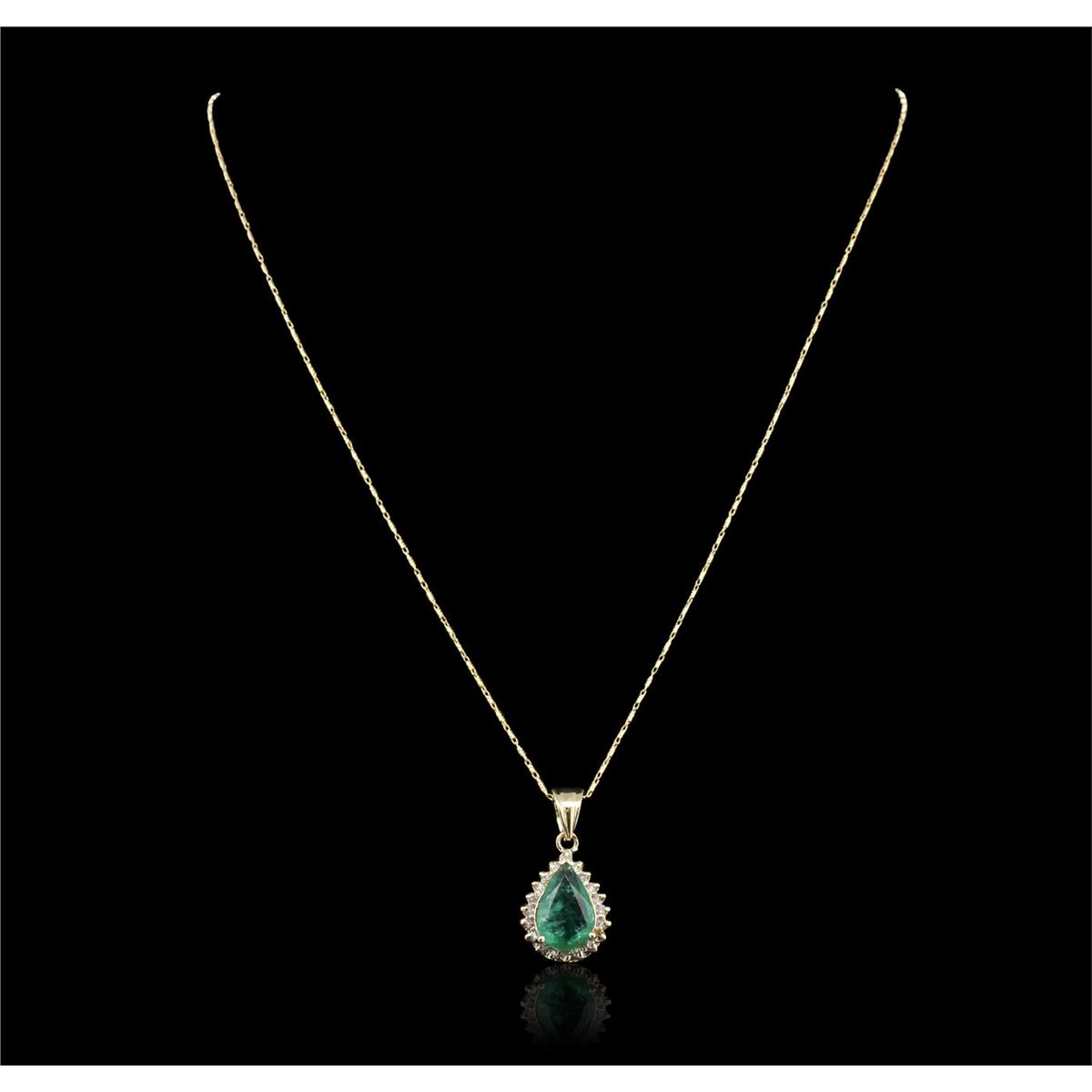 One electronically tested 14KT yellow gold ladies cast & assembled emerald and diamond pendant with chain. Condition is new, good workmanship. The pendant features an emerald set within a diamond bezel, completed by a yellow gold bail. The pendant is supported by an eighteen inch length 14KT yellow gold designer style chain, terminating in a lobster claw clasp. Bright polish finish. Containing: One prong set pear mixed cut natural emerald, measuring 13.20 x 8.10 x 4.20mm, 5%. bulge factor, approximate weight of 2.58ct., clarity is heavily included, type III, medium dark, very slightly grayish, very slightly bluish green color, (GIA vslbG 6/3), cut is good. Transmitting light with a minimum of distortion, transparent. Naturally occurring internal & external characteristics are present. Indications of oil residue. Graded in the setting. Twenty prong set round brilliant cut diamonds, measuring 1.70 - 1.60 x 0.99mm (depth est.) approximate. Total Weight of 20 Stones = 0.35ct. Graded in the setting. Clarity: SI-1 to SI-2. Color: G - I. Total Weight of Colored Stones 2.58ct. Total Weight of Diamonds 0.35ct. Total Weight of Pendant With Chain 5.46 grams. AIG Appraised at $6,215.00.