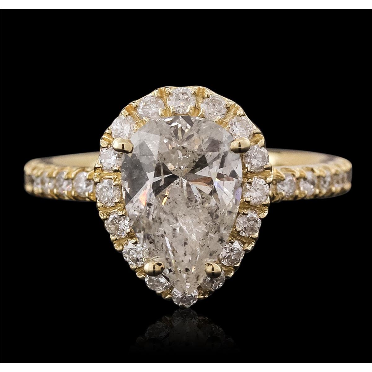 One electronically tested 14KT yellow gold ladies combination cast & assembled engagement ring with a flat shank with a bright polish finish. Identified with markings of "14K". Condition is new. Containing: One prong set pear shaped cut diamond, measuring 11.11 x 7.37 x 4.54mm (depth est.) approximate weight of 2.19ct. Clarity: I-2. Color: H, Cut is Good. Thirty prong set round brilliant cut diamonds, measuring 1.60 - 1.50 x 0.93mm (depth est.) approximate total weight of 30 Stones = 0.41ct. Clarity: I-1 to I-2. Color: I - J, Cut is Good. All diamonds are graded in the mounting, unless otherwise stated. Total Weight of Diamonds 2.60ct. Total Weight of Ring 3.70 grams. GGL Appraised at $18,770.00.
