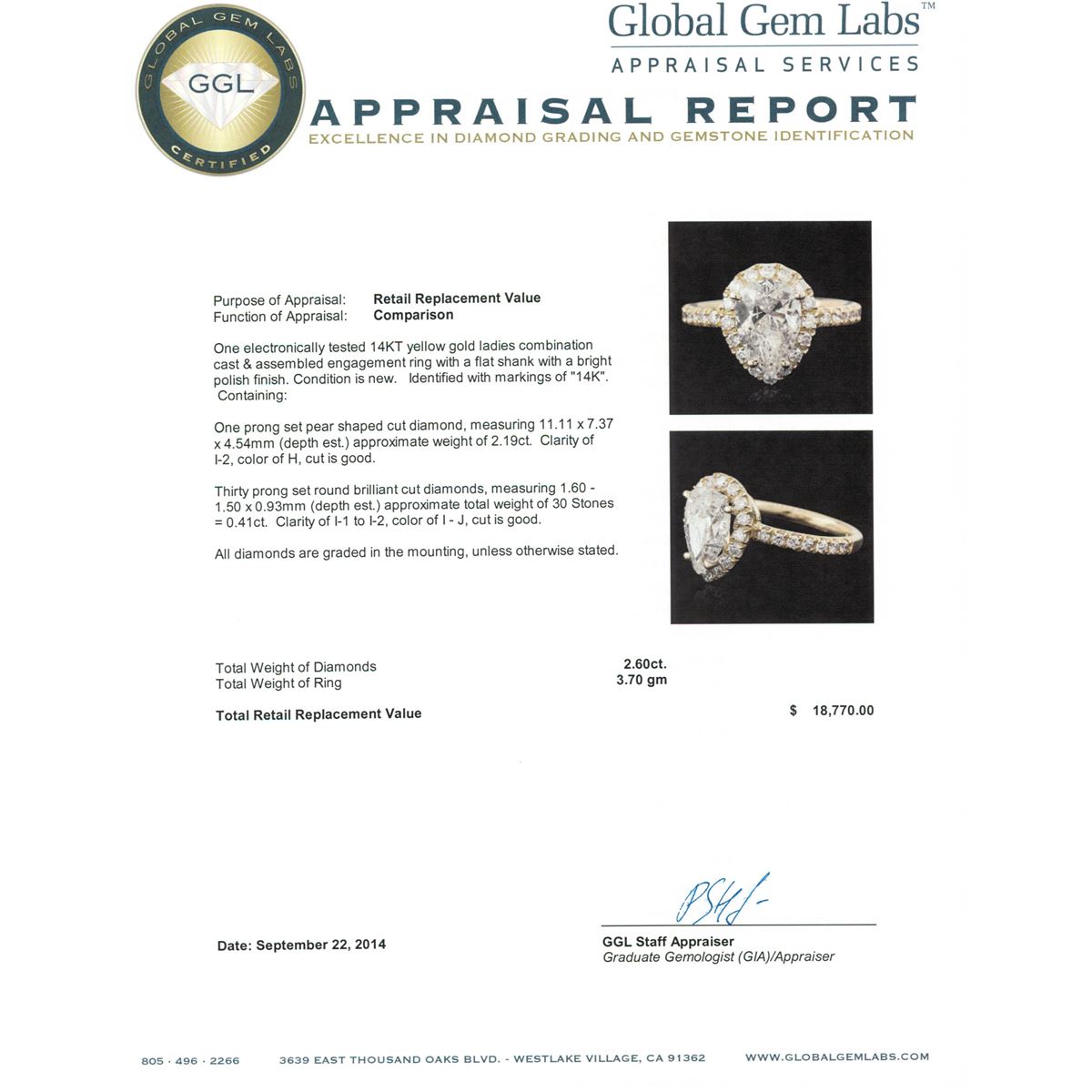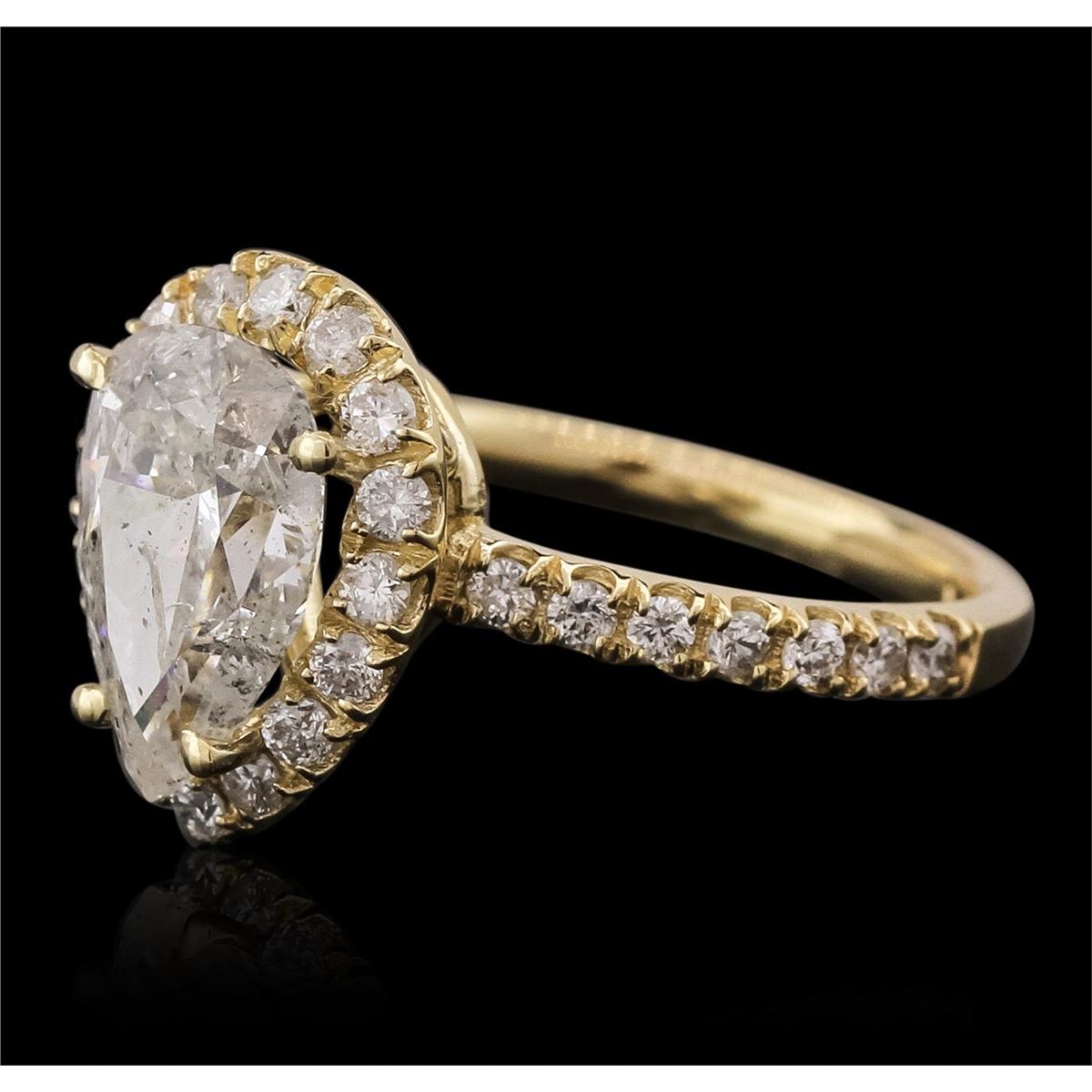 One electronically tested 14KT yellow gold ladies combination cast & assembled engagement ring with a flat shank with a bright polish finish. Identified with markings of "14K". Condition is new. Containing: One prong set pear shaped cut diamond, measuring 11.11 x 7.37 x 4.54mm (depth est.) approximate weight of 2.19ct. Clarity: I-2. Color: H, Cut is Good. Thirty prong set round brilliant cut diamonds, measuring 1.60 - 1.50 x 0.93mm (depth est.) approximate total weight of 30 Stones = 0.41ct. Clarity: I-1 to I-2. Color: I - J, Cut is Good. All diamonds are graded in the mounting, unless otherwise stated. Total Weight of Diamonds 2.60ct. Total Weight of Ring 3.70 grams. GGL Appraised at $18,770.00.