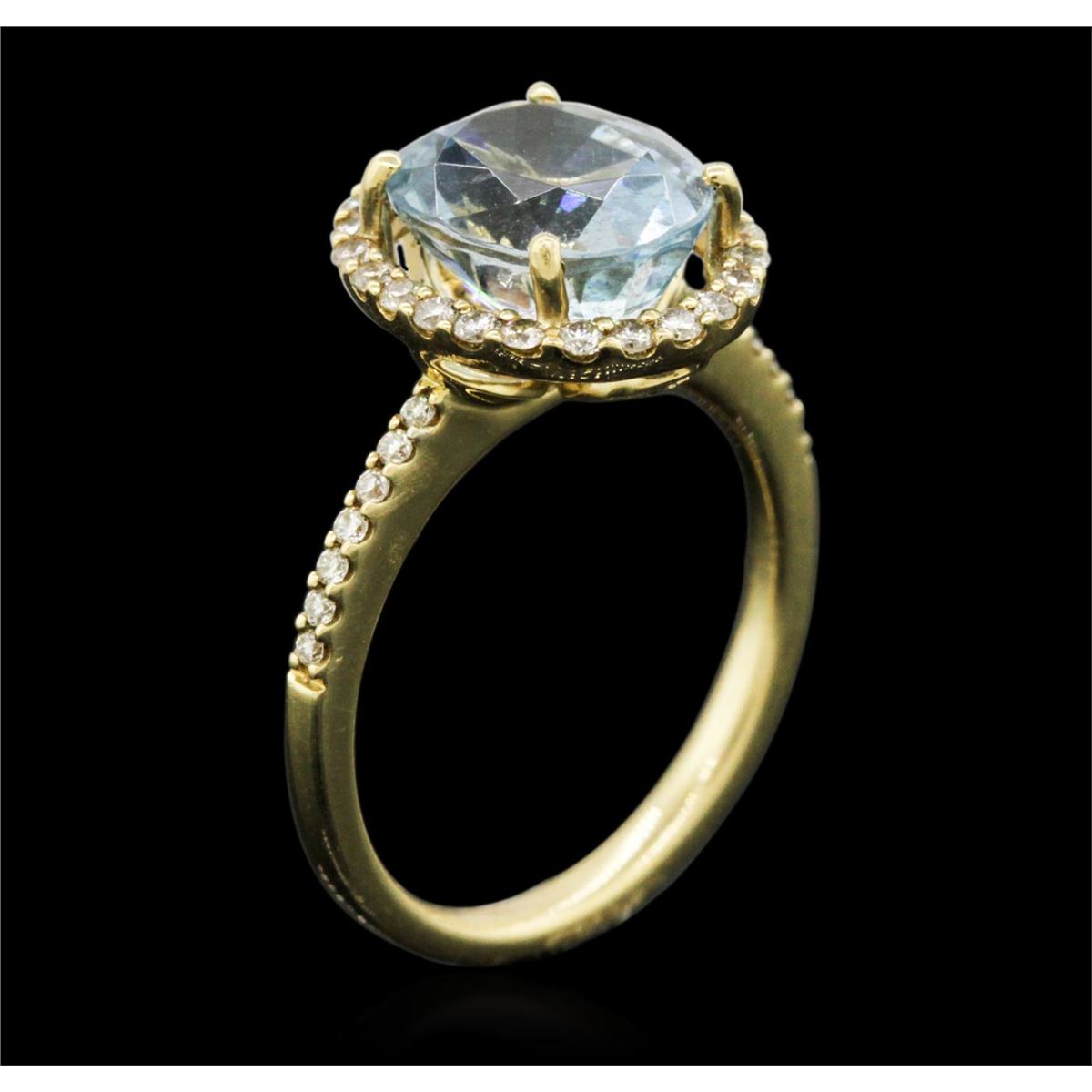 One electronically tested 14KT yellow gold ladies cast aquamarine and diamond ring with a bright polish finish. Identified with markings of "14K". Condition is new. Containing: One prong set oval modified brilliant cut natural aquamarine, measuring 10.00 x 8.40 x 5.46mm, approximate weight of 2.62ct., clarity is eye clean, type I, light, very slightly grayish, blue color, (GIA B 3/3), cut is good. Thirty-Eight prong set round brilliant cut diamonds, measuring 1.10 - 1.10 x 0.66mm (depth est.) approximate total weight of 38 Stones = 0.18ct. Clarity: SI-2 to I-1. Color: J - K, Cut is Good. Colored gemstones are presumed to have been subjected to commonly used enhancement processes. All diamonds and colored gemstones are graded in the mounting, unless otherwise stated. Total Weight of Colored Stones 2.62ct. Total Weight of Diamonds 0.18ct. Total Weight of Ring 3.80 grams. GGL Appraised at $2,745.00.