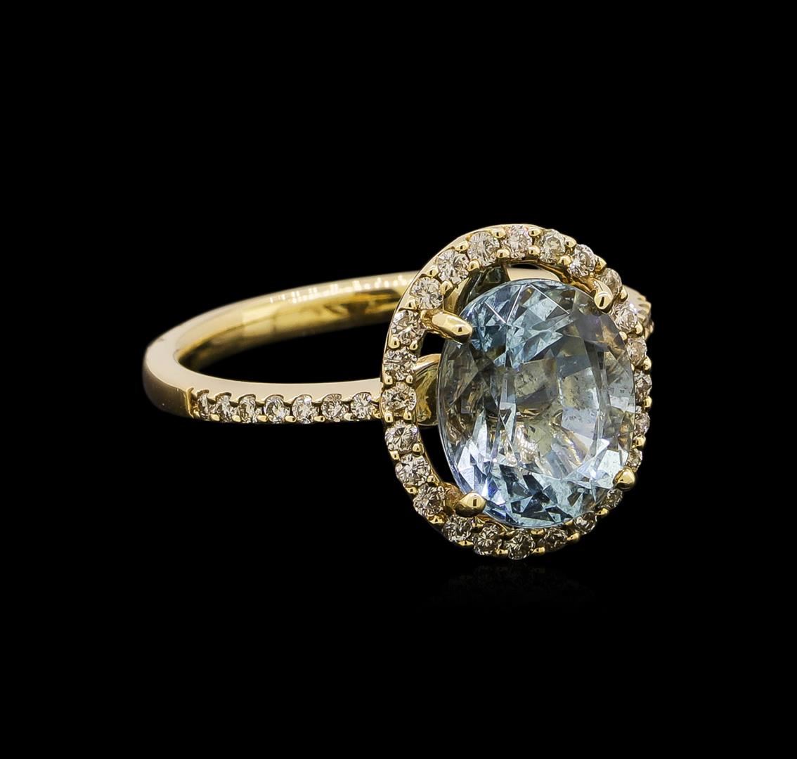 One electronically tested 14KT yellow gold ladies cast aquamarine and diamond ring with a bright polish finish. Identified with markings of "14K". Condition is new. Containing: One prong set oval modified brilliant cut natural aquamarine, measuring 10.00 x 8.40 x 5.46mm, approximate weight of 2.62ct., clarity is eye clean, type I, light, very slightly grayish, blue color, (GIA B 3/3), cut is good. Thirty-Eight prong set round brilliant cut diamonds, measuring 1.10 - 1.10 x 0.66mm (depth est.) approximate total weight of 38 Stones = 0.18ct. Clarity: SI-2 to I-1. Color: J - K, Cut is Good. Colored gemstones are presumed to have been subjected to commonly used enhancement processes. All diamonds and colored gemstones are graded in the mounting, unless otherwise stated. Total Weight of Colored Stones 2.62ct. Total Weight of Diamonds 0.18ct. Total Weight of Ring 3.80 grams. GGL Appraised.