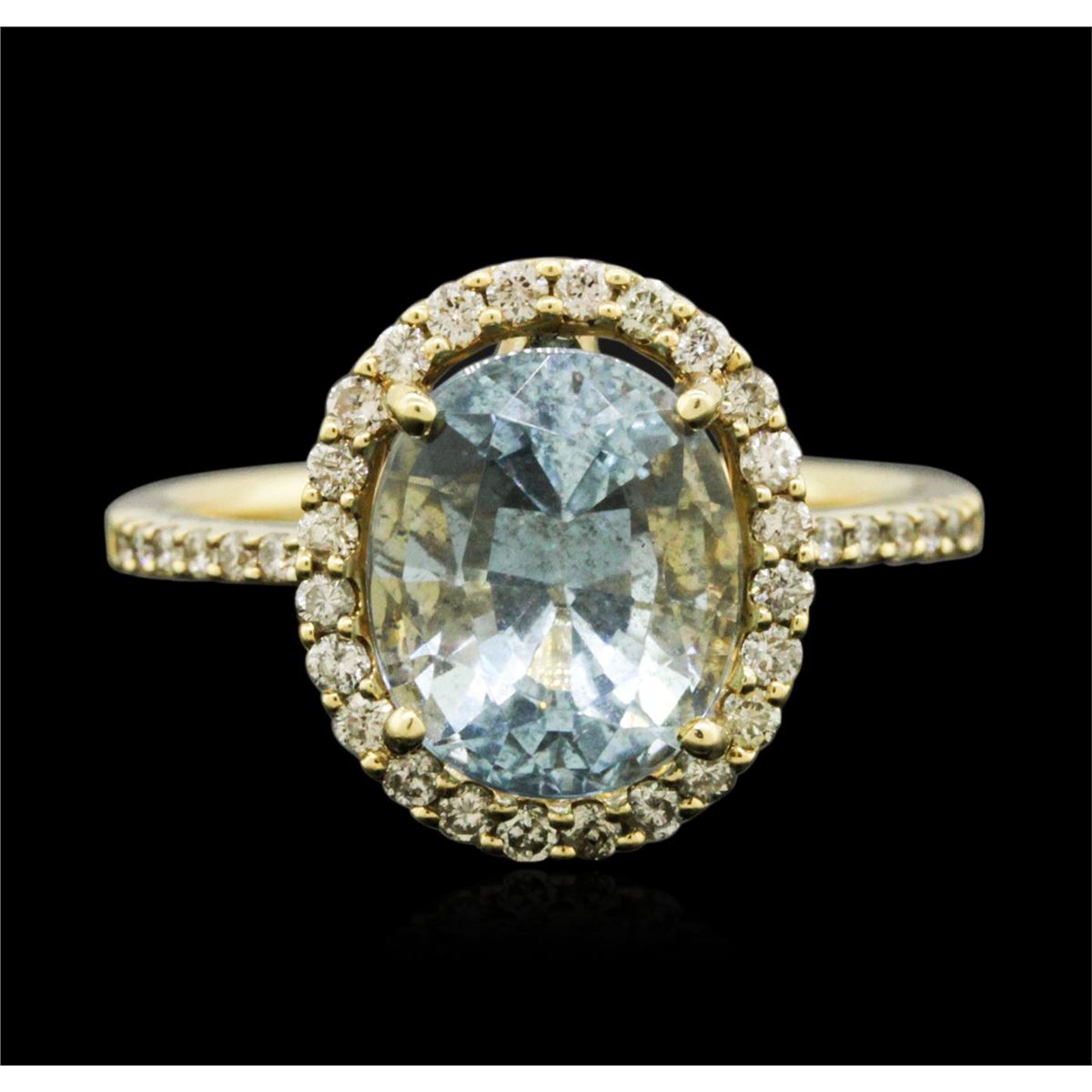 One electronically tested 14KT yellow gold ladies cast aquamarine and diamond ring with a bright polish finish. Identified with markings of "14K". Condition is new. Containing: One prong set oval modified brilliant cut natural aquamarine, measuring 10.00 x 8.40 x 5.46mm, approximate weight of 2.62ct., clarity is eye clean, type I, light, very slightly grayish, blue color, (GIA B 3/3), cut is good. Thirty-Eight prong set round brilliant cut diamonds, measuring 1.10 - 1.10 x 0.66mm (depth est.) approximate total weight of 38 Stones = 0.18ct. Clarity: SI-2 to I-1. Color: J - K, Cut is Good. Colored gemstones are presumed to have been subjected to commonly used enhancement processes. All diamonds and colored gemstones are graded in the mounting, unless otherwise stated. Total Weight of Colored Stones 2.62ct. Total Weight of Diamonds 0.18ct. Total Weight of Ring 3.80 grams. GGL Appraised at $2,745.00.