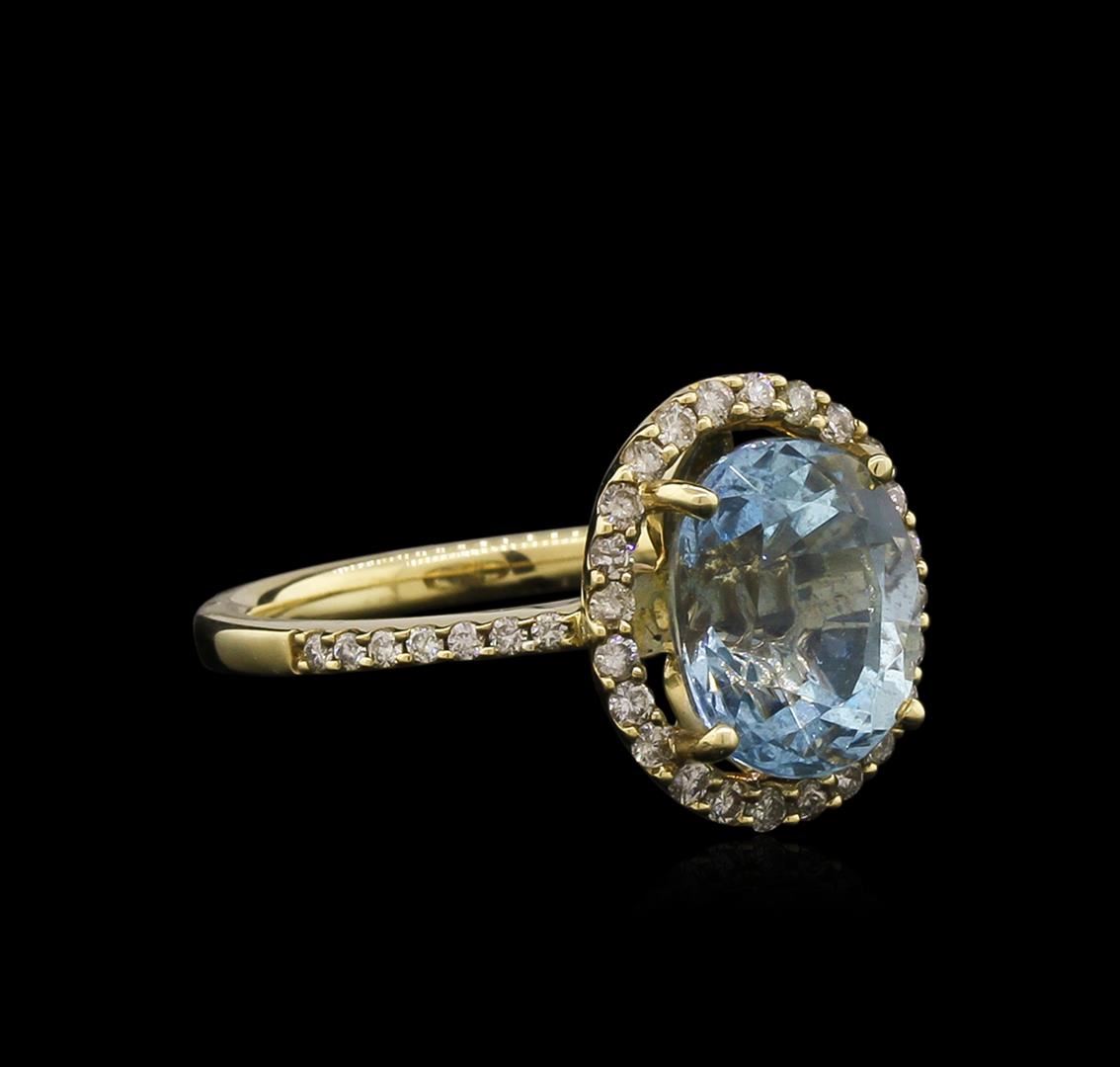 One electronically tested 14KT yellow gold ladies cast aquamarine and diamond ring with a bright polish finish. Identified with markings of "14K". Condition is new. Containing: One prong set oval modified brilliant cut natural aquamarine, measuring 10.00 x 8.40 x 5.46mm, approximate weight of 2.62ct., clarity is eye clean, type I, light, very slightly grayish, blue color, (GIA B 3/3), cut is good. Thirty-Eight prong set round brilliant cut diamonds, measuring 1.10 - 1.10 x 0.66mm (depth est.) approximate total weight of 38 Stones = 0.18ct. Clarity: SI-2 to I-1. Color: J - K, Cut is Good. Colored gemstones are presumed to have been subjected to commonly used enhancement processes. All diamonds and colored gemstones are graded in the mounting, unless otherwise stated. Total Weight of Colored Stones 2.62ct. Total Weight of Diamonds 0.18ct. Total Weight of Ring 3.80 grams. GGL Appraised at $2,745.00.
