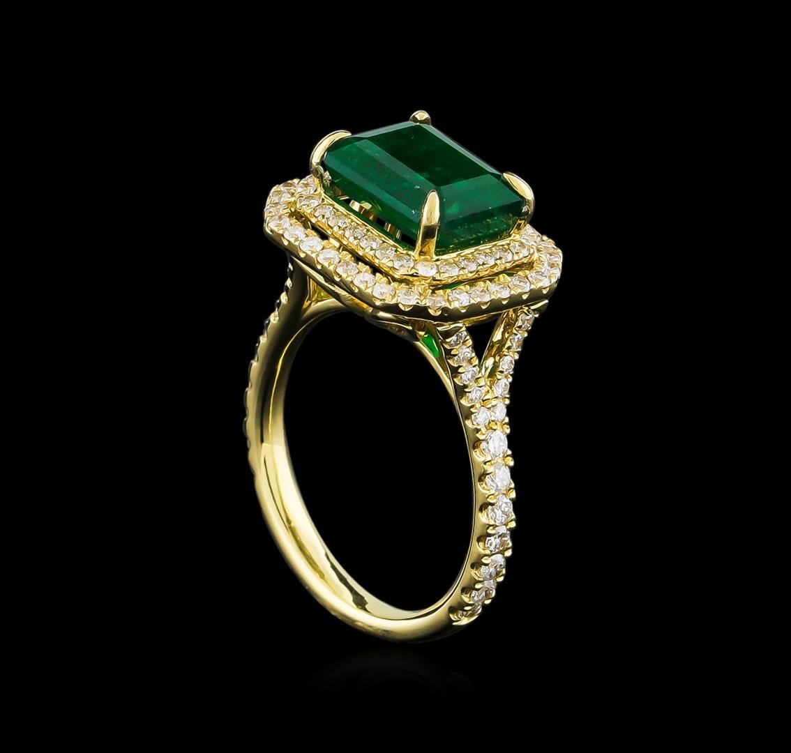 One electronically tested 14KT yellow gold ladies cast emerald and diamond ring with a bright polish finish. The featured emerald is set within two tiered diamond bezels supported by diamond set split shoulders, completed by a two and one-half millimeter wide band. Identified with markings of "14K". Condition is new, good workmanship. Containing: One prong set rectangular step cut natural emerald, measuring 10.35 x 8.00 x 3.60mm, 8% bulge factor, approximate weight of 2.63ct., clarity is heavily included, type III, dark, moderately strong, very slightly bluish green color, (GIA vslbG 7/4), cut is good. Transmitting light with a minimum of distortion, transparent. Naturally occurring internal & external characteristics are present. Indications of oil residue. Graded in the setting. Fourteen prong set round brilliant cut diamonds, measuring 1.90 - 1.80 x 1.11mm (depth est.) approximate total weight of 14 Stones = 0.42ct. Graded in the setting. Clarity: SI-1 to I-1. Color: G - I Eighty prong set round brilliant cut diamonds, measuring 1.40 - 1.30 x 0.81mm (depth est.) approximate total weight of 80 Stones = 0.82ct. Graded in the setting. Clarity: SI-1 to I-2. Color: G - I. Total Weight of Colored Stones 2.63ct. Total Weight of Diamonds 1.24ct. Total Weight of Ring 6.58 grams. AIG Appraised at $9,535.00.