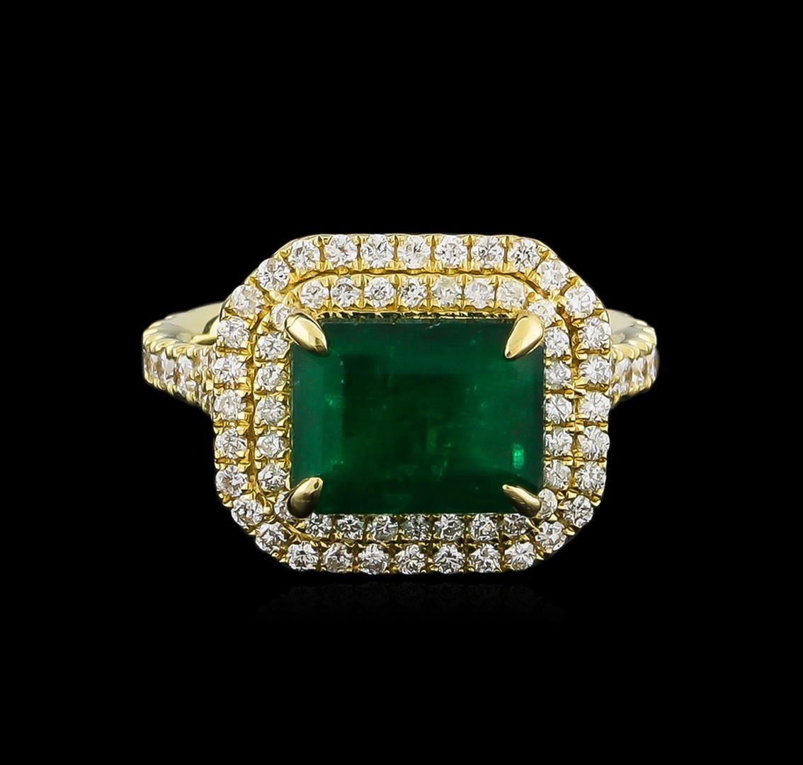 One electronically tested 14KT yellow gold ladies cast emerald and diamond ring with a bright polish finish. The featured emerald is set within two tiered diamond bezels supported by diamond set split shoulders, completed by a two and one-half millimeter wide band. Identified with markings of "14K". Condition is new, good workmanship. Containing: One prong set rectangular step cut natural emerald, measuring 10.35 x 8.00 x 3.60mm, 8% bulge factor, approximate weight of 2.63ct., clarity is heavily included, type III, dark, moderately strong, very slightly bluish green color, (GIA vslbG 7/4), cut is good. Transmitting light with a minimum of distortion, transparent. Naturally occurring internal & external characteristics are present. Indications of oil residue. Graded in the setting. Fourteen prong set round brilliant cut diamonds, measuring 1.90 - 1.80 x 1.11mm (depth est.) approximate total weight of 14 Stones = 0.42ct. Graded in the setting. Clarity: SI-1 to I-1. Color: G - I Eighty prong set round brilliant cut diamonds, measuring 1.40 - 1.30 x 0.81mm (depth est.) approximate total weight of 80 Stones = 0.82ct. Graded in the setting. Clarity: SI-1 to I-2. Color: G - I. Total Weight of Colored Stones 2.63ct. Total Weight of Diamonds 1.24ct. Total Weight of Ring 6.58 grams. AIG Appraised at $9,535.00.