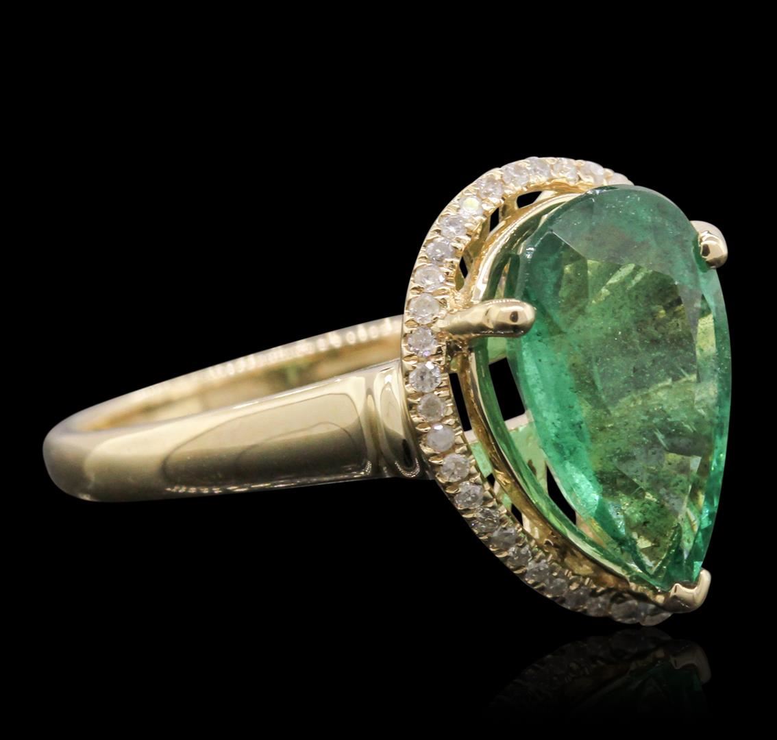 One electronically tested 14KT yellow gold ladies cast emerald and diamond ring with a bright polish finish. The emerald is set within a diamond bezel supported by tapering shoulders, completed by a one and one-half millimeter wide band. Trademark is Orianne. Identified with markings of "14K". Condition is new, good workmanship. Containing: One prong set pear mixed cut natural emerald, measuring 13.00 x 7.80 x 4.50mm, 8%. bulge factor, approximate weight of 2.68ct., clarity is heavily included, type III, medium dark, moderately strong, very slightly bluish green color, (GIA vslbG 6/4), cut is good. Transmitting light with a minimum of distortion, transparent. Naturally occurring internal & external characteristics are present. Indications of oil residue. Graded in the setting. Thirty-Nine prong set round brilliant cut diamonds, measuring 1.10 - 1.00 x 0.63mm (depth est.) approximate. Total Weight of 39 Stones = 0.26ct. Graded in the setting. Clarity: I-1 to I-2 . Color: G - I. Total Weight of Colored Stones 2.68ct. Total Weight of Diamonds 0.26ct. Total Weight of Ring 3.69gm. AIG Appraised at $6,925.00.