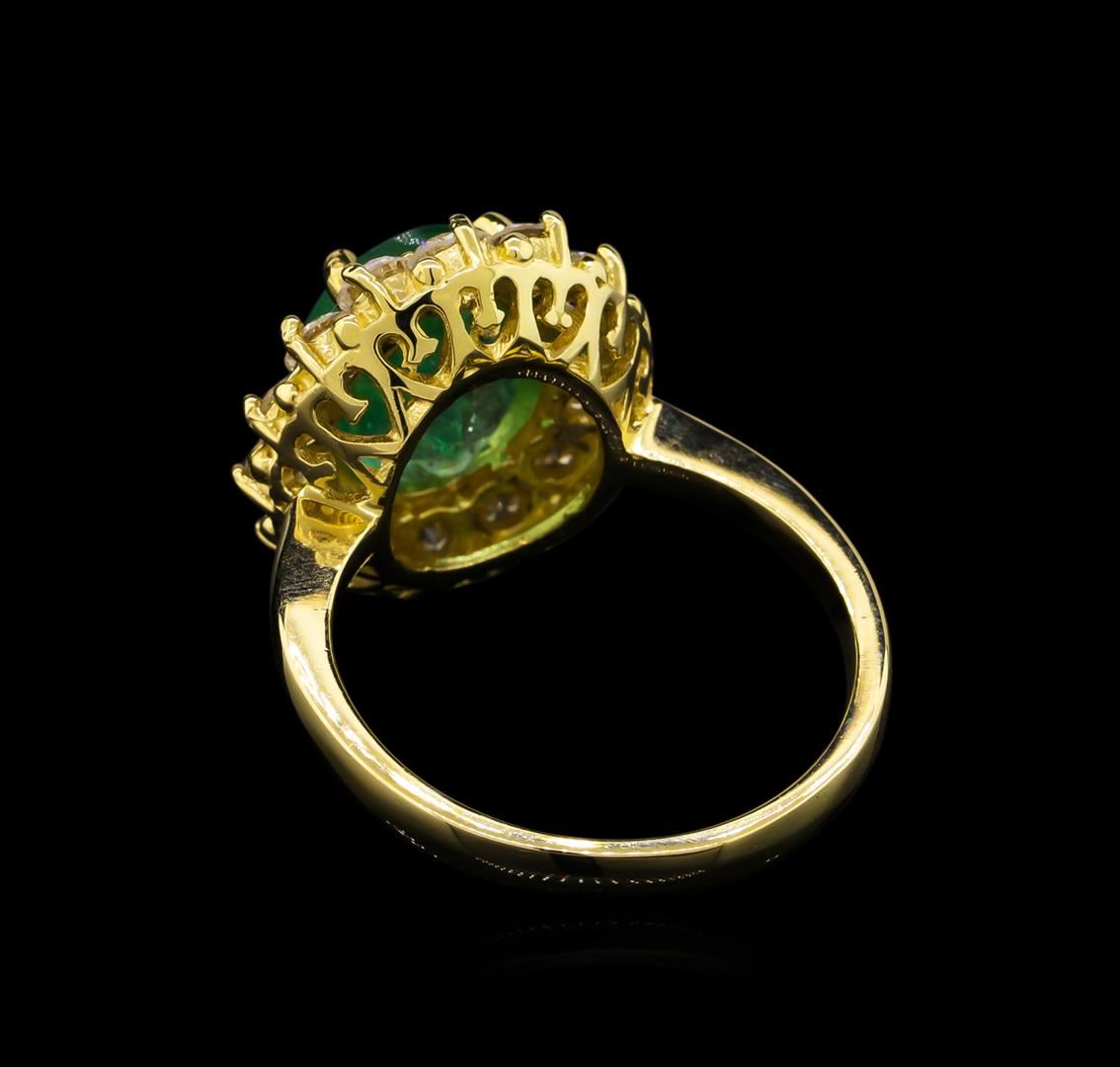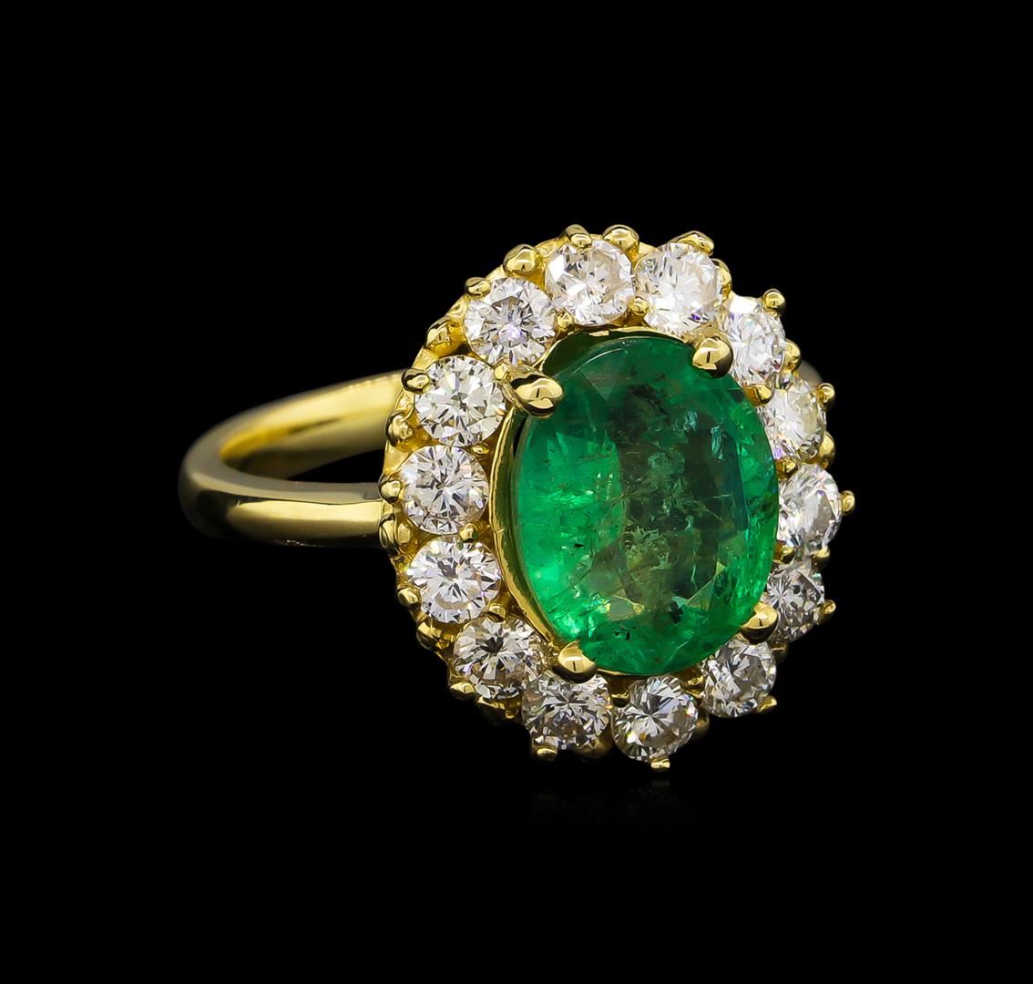 One electronically tested 14KT yellow gold ladies cast emerald and diamond ring with a bright polish finish. Condition is new, good workmanship. The featured emerald is set within a diamond bezel supported by tapering shoulders, completed by a two and one-half millimeter wide band. Identified with markings of "K14". Containing: One prong set oval mixed cut natural emerald, measuring 10.45 x 8.40 x 5.25mm, 6% bulge factor, approximate weight of 2.69ct, clarity is heavily included, type III, medium dark, very slightly grayish, very slightly bluish green color, (GIA vslbG 6/3), cut is good. Transmitting light with a minimum of distortion, transparent. Naturally occurring internal & external characteristics are present. Indications of oil residue. Graded in the setting. Fourteen prong set round brilliant cut diamonds, measuring 2.90 - 2.80 x 1.71mm (depth est.) approximate total weight of 14 Stones = 1.28ct. Graded in the setting. Clarity SI-1 to SI-2 Color G - I Total Weight of Colored Stones 2.69ct. Total Weight of Diamonds 1.28ct. Total Weight of Ring 5.52 grams. AIG Appraised at $6,535.00.