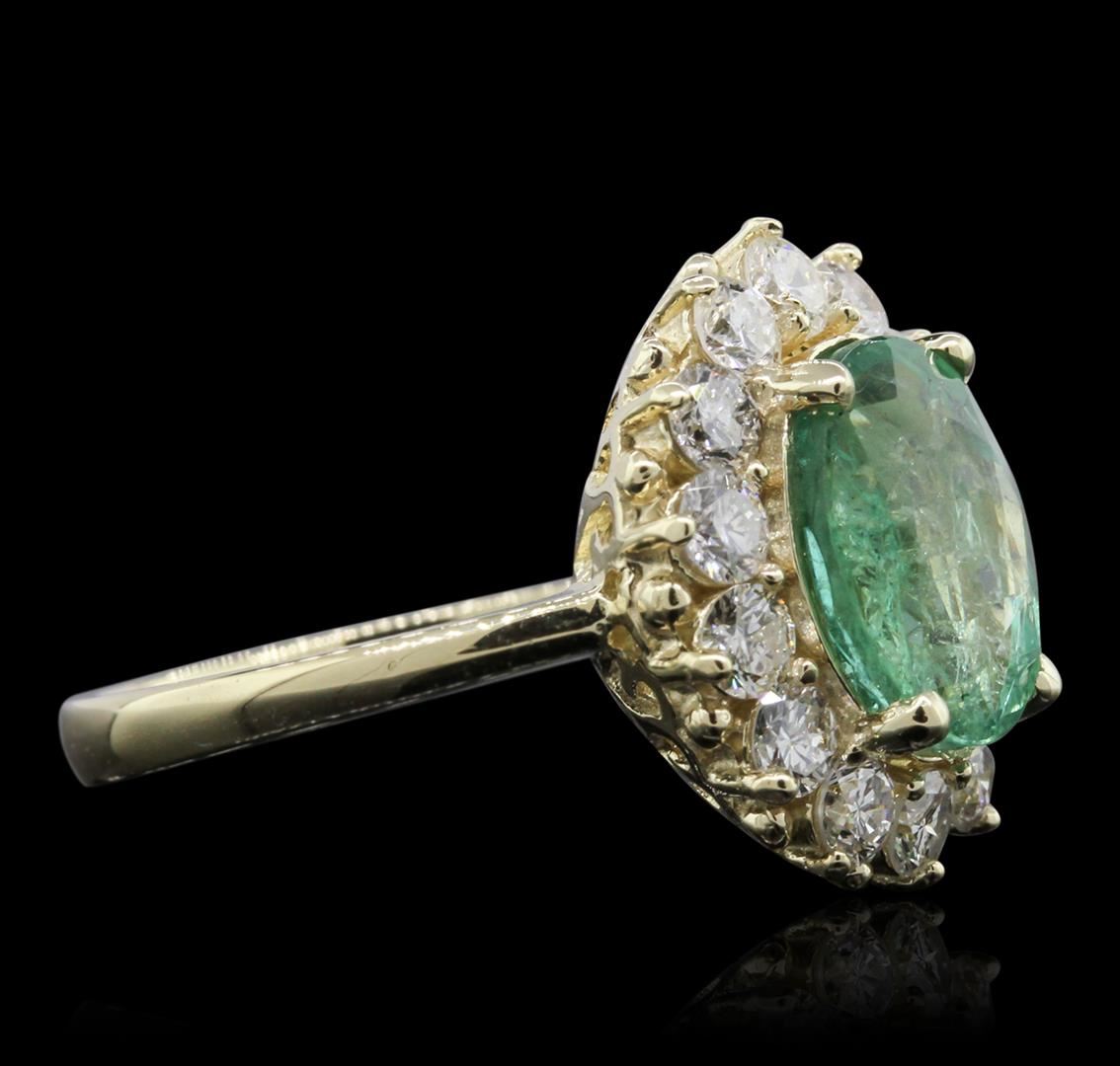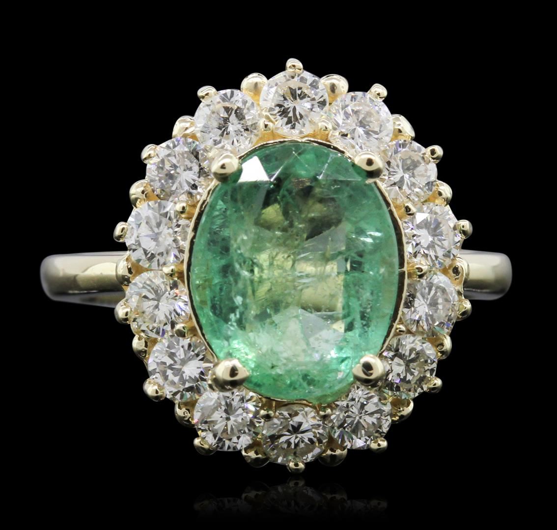 One electronically tested 14KT yellow gold ladies cast emerald and diamond ring with a bright polish finish. Condition is new, good workmanship. The featured emerald is set within a diamond bezel supported by tapering shoulders, completed by a two and one-half millimeter wide band. Identified with markings of "K14". Containing: One prong set oval mixed cut natural emerald, measuring 10.45 x 8.40 x 5.25mm, 6% bulge factor, approximate weight of 2.69ct, clarity is heavily included, type III, medium dark, very slightly grayish, very slightly bluish green color, (GIA vslbG 6/3), cut is good. Transmitting light with a minimum of distortion, transparent. Naturally occurring internal & external characteristics are present. Indications of oil residue. Graded in the setting. Fourteen prong set round brilliant cut diamonds, measuring 2.90 - 2.80 x 1.71mm (depth est.) approximate total weight of 14 Stones = 1.28ct. Graded in the setting. Clarity SI-1 to SI-2 Color G - I Total Weight of Colored Stones 2.69ct. Total Weight of Diamonds 1.28ct. Total Weight of Ring 5.52 grams. AIG Appraised at $6,535.00.