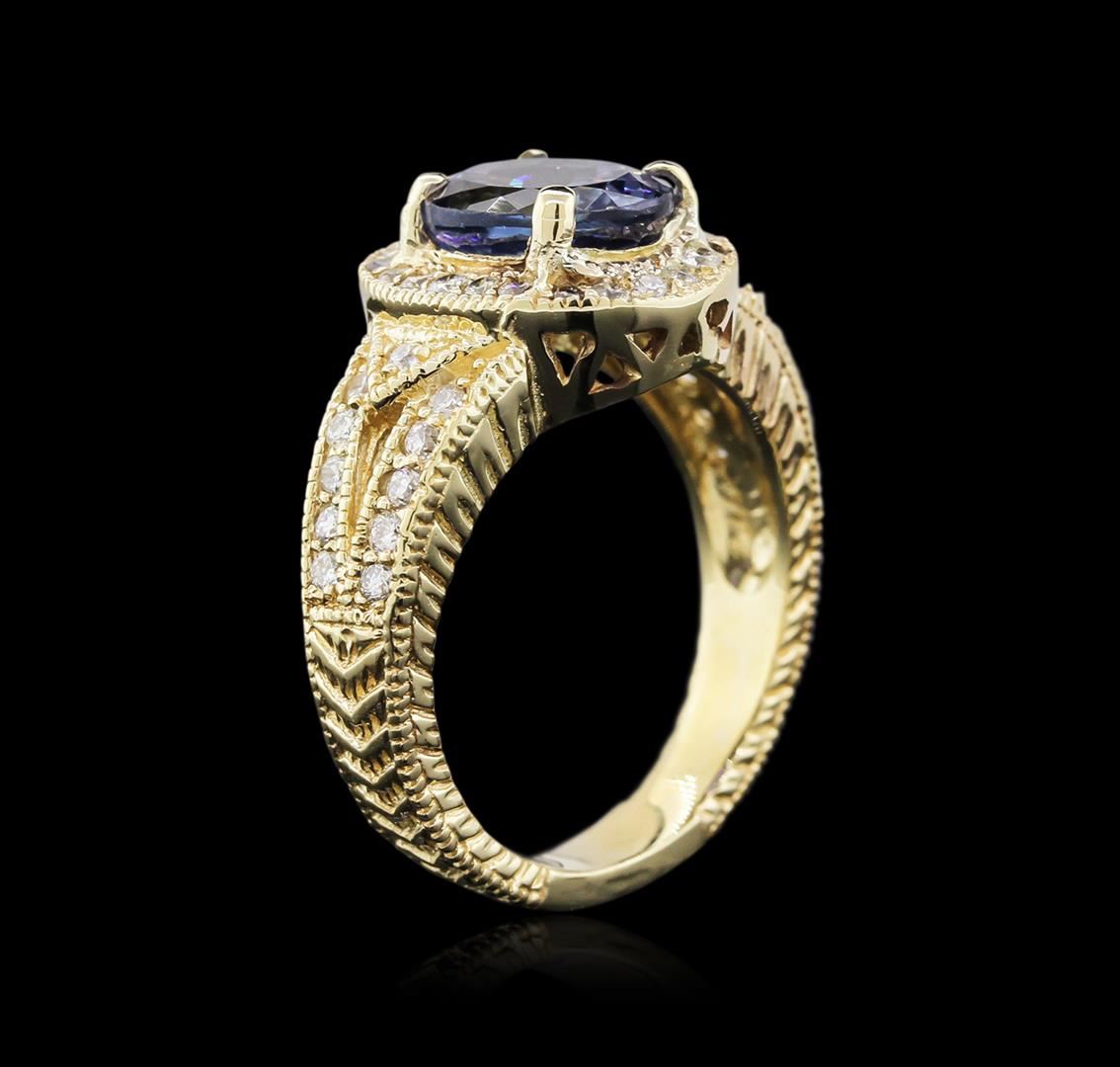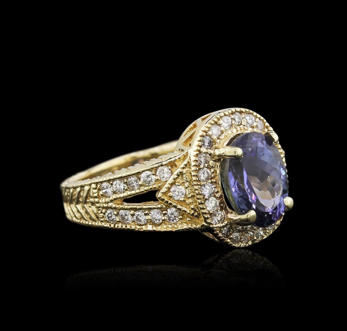 One electronically tested 14KT yellow gold ladies cast tanzanite and diamond ring with a bright polish finish. Condition is new. Containing: One prong set oval modified brilliant cut natural tanzanite, measuring 9.20 x 7.30 x 4.75mm, approximate weight of 2.70ct., clarity is eye clean, type I, medium, moderately strong, violet color, (GIA V 5/4), cut is good. Forty-Four prong set round brilliant cut diamonds, measuring 1.50 - 1.50 x 0.90mm (depth est.) approximate total weight of 44 Stones = 0.59ct. Clarity: SI-1 to SI-2. Color: I - J, Cut is Good. Colored gemstones are presumed to have been subjected to commonly used enhancement processes. All diamonds and colored gemstones are graded in the mounting, unless otherwise stated. Total Weight of Colored Stones 2.70ct. Total Weight of Diamonds 0.59ct. Total Weight of Ring 7.00 grams. GGL Appraised at $4,020.00.