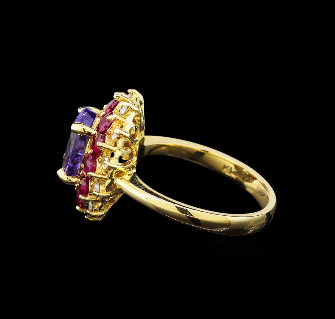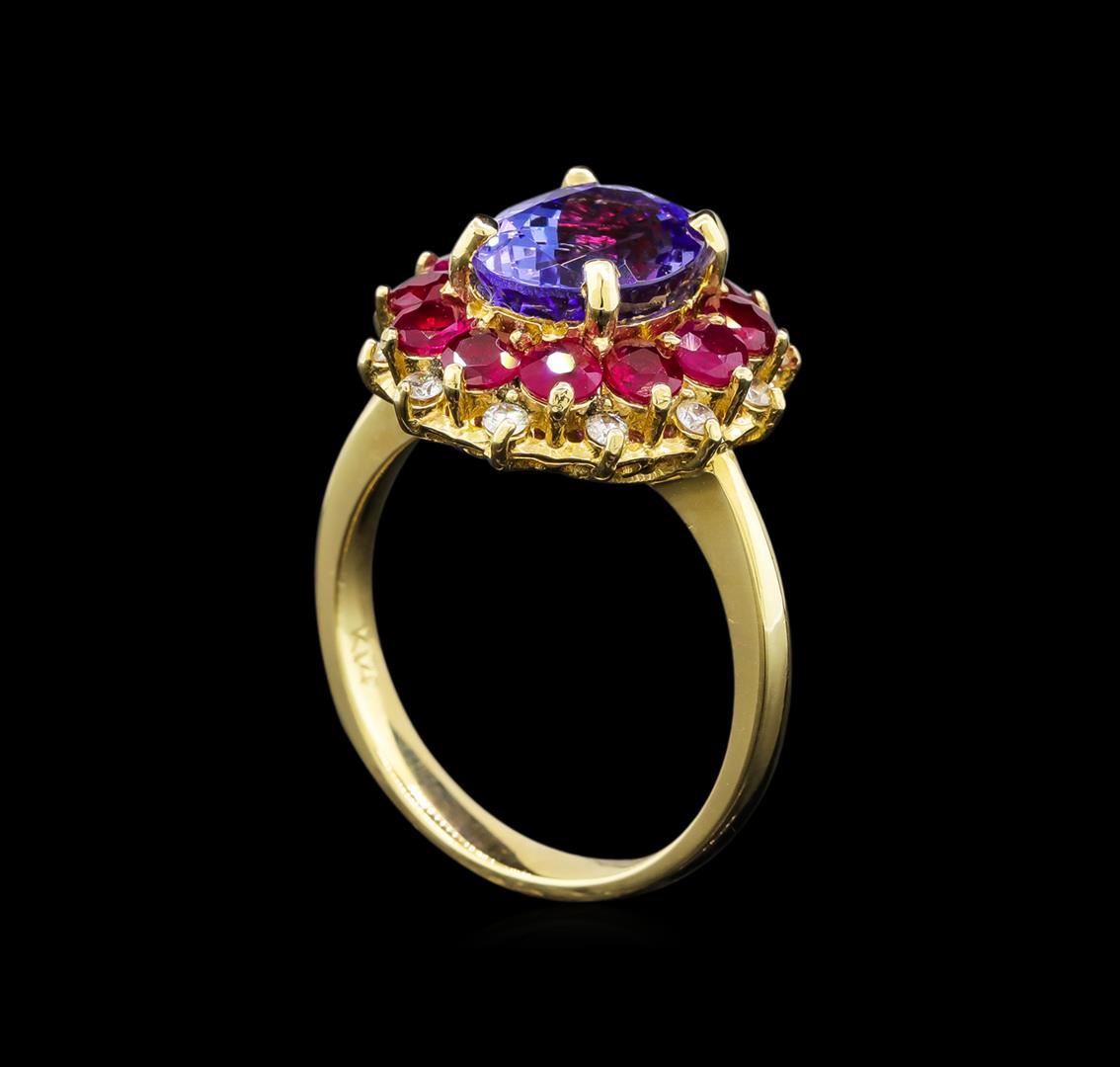 One electronically tested 14KT yellow gold ladies cast tanzanite, ruby and diamond ring with a bright polish finish. Identified with markings of "14K". Condition is new. Containing: One prong set oval modified brilliant cut natural tanzanite, measuring 9.90 x 7.80 x 5.07mm, approximate weight of 2.75ct., clarity is eye clean, type I, medium, very slightly grayish, violet color, (GIA V 5/3), cut is good. Twelve prong set round modified brilliant cut natural rubies, measuring 3.00 - 3.00 x 1.95 mm, approximate total weight of 1.68ct., clarity is heavily included, medium, moderately strong, strongly purplish red color, (GIA stpR 5/4), cut is good. Twelve prong set round brilliant cut diamonds, measuring 2.00 - 2.00 x 1.20mm (depth est.) approximate total weight of 12 Stones = 0.35ct. Clarity: SI-2 to I-1. Color: K - L. Colored gemstones are presumed to have been subjected to commonly used enhancement processes. All diamonds and colored gemstones are graded in the mounting, unless otherwise stated. Total Weight of Colored Stones 4.43ct. Total Weight of Diamonds 0.35ct. Total Weight of Ring 6.40 grams. GGL Appraised at $3,870.00.