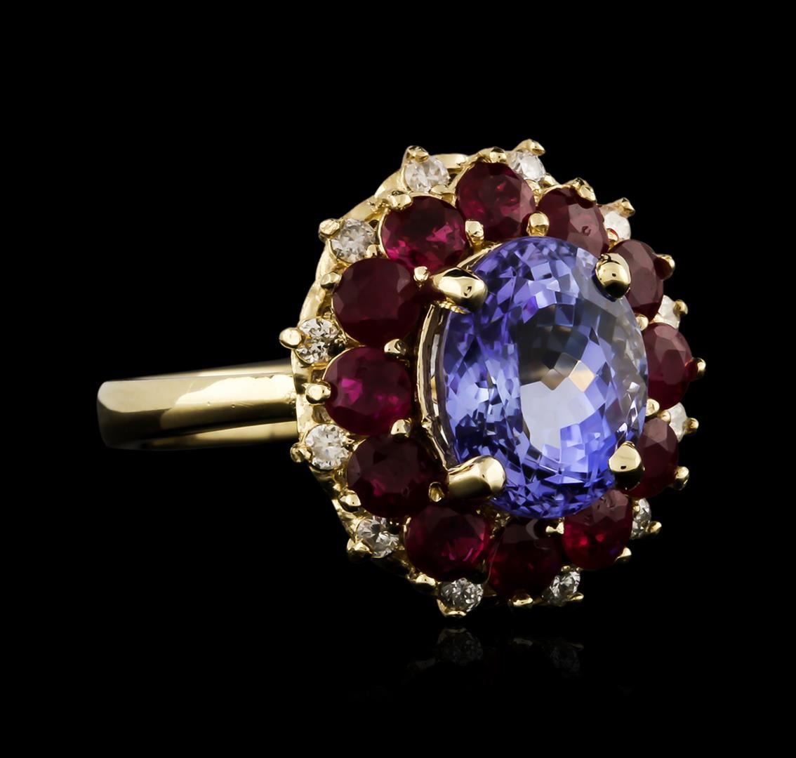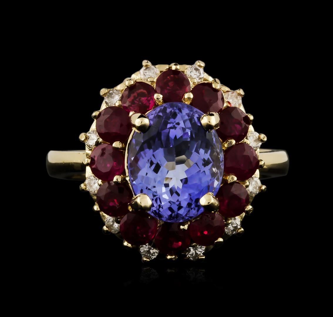 One electronically tested 14KT yellow gold ladies cast tanzanite, ruby and diamond ring with a bright polish finish. Identified with markings of "14K". Condition is new. Containing: One prong set oval modified brilliant cut natural tanzanite, measuring 9.90 x 7.80 x 5.07mm, approximate weight of 2.75ct., clarity is eye clean, type I, medium, very slightly grayish, violet color, (GIA V 5/3), cut is good. Twelve prong set round modified brilliant cut natural rubies, measuring 3.00 - 3.00 x 1.95 mm, approximate total weight of 1.68ct., clarity is heavily included, medium, moderately strong, strongly purplish red color, (GIA stpR 5/4), cut is good. Twelve prong set round brilliant cut diamonds, measuring 2.00 - 2.00 x 1.20mm (depth est.) approximate total weight of 12 Stones = 0.35ct. Clarity: SI-2 to I-1. Color: K - L. Colored gemstones are presumed to have been subjected to commonly used enhancement processes. All diamonds and colored gemstones are graded in the mounting, unless otherwise stated. Total Weight of Colored Stones 4.43ct. Total Weight of Diamonds 0.35ct. Total Weight of Ring 6.40 grams. GGL Appraised at $3,870.00.