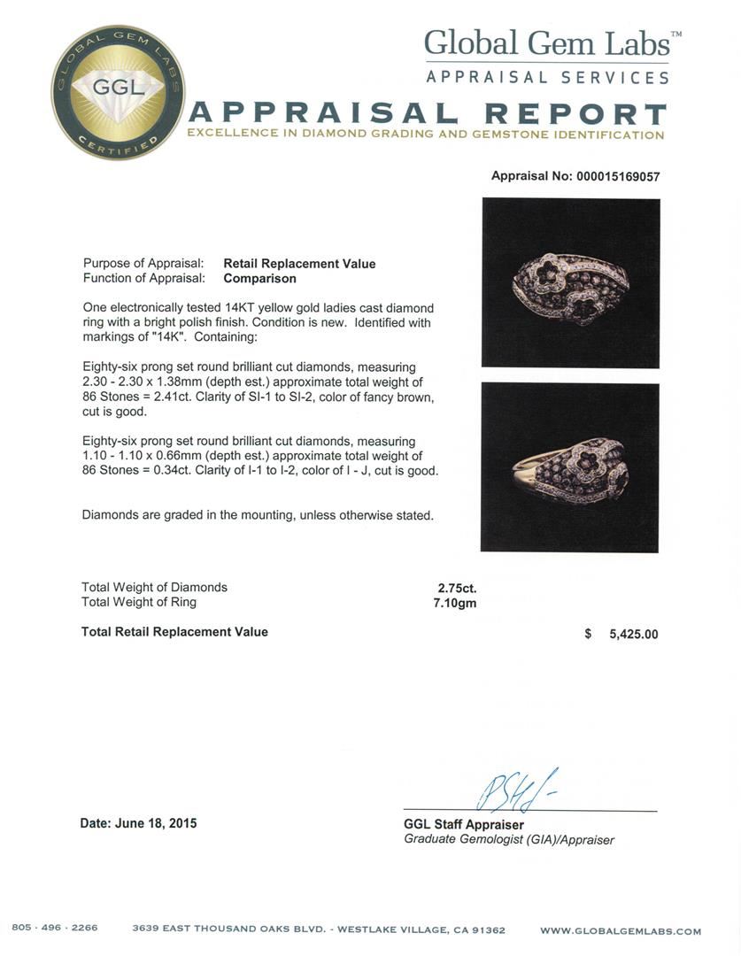 One electronically tested 14KT yellow gold ladies cast diamond ring with a bright polish finish. Identified with markings of "14K". Condition is new. Containing: Eighty-Six prong set round brilliant cut diamonds, measuring 2.30 - 2.30 x 1.38mm (depth est.) approximate total weight of 86 Stones = 2.41ct. Clarity: SI-1 to SI-2, Cut is Good. Eighty-Six prong set round brilliant cut diamonds, measuring 1.10 - 1.10 x 0.66mm (depth est.) approximate total weight of 86 Stones = 0.34ct. Clarity: I-1 to I-2. Color: I - J, Cut is Good. Diamonds are graded in the mounting, unless otherwise stated. Total Weight of Diamonds 2.75ct. Total Weight of Ring 7.10 grams. GGL Appraised at $5,425.00.