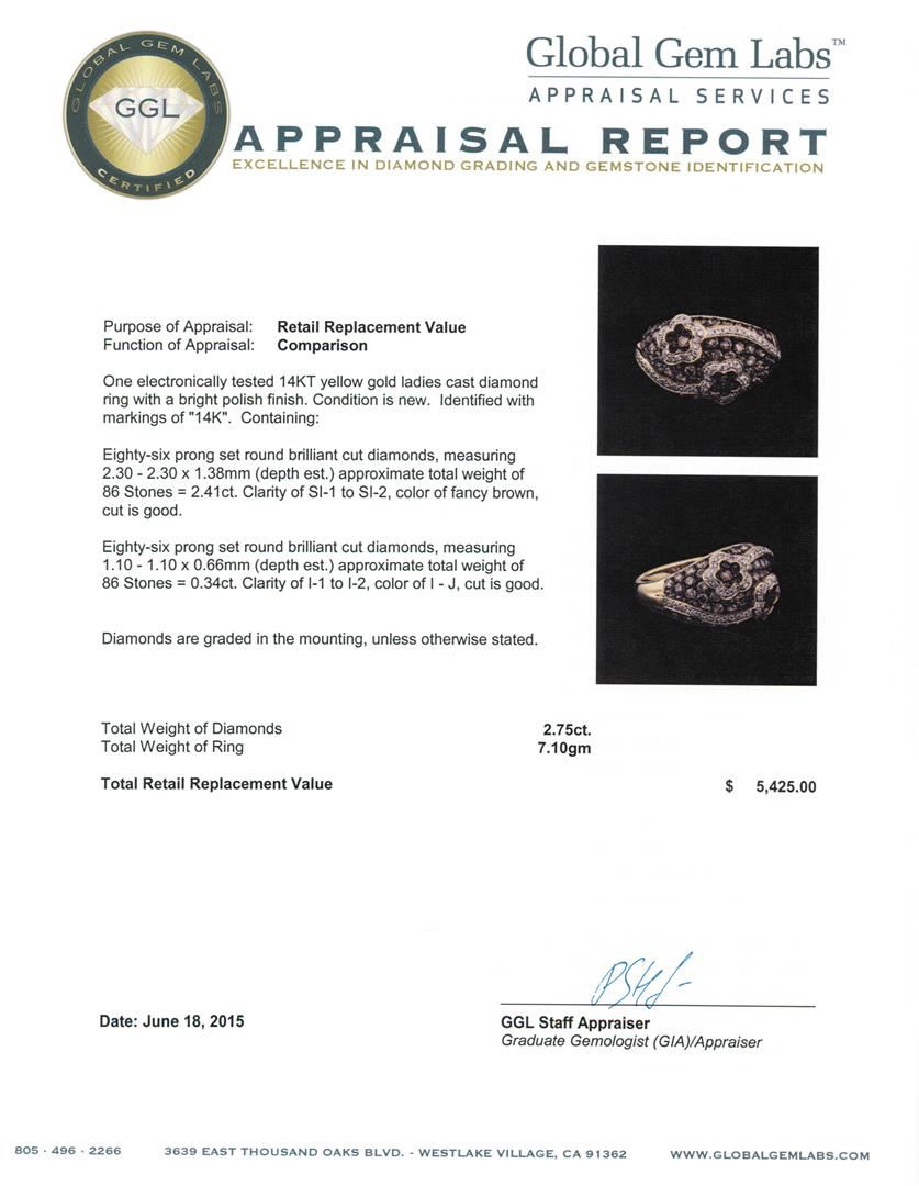 One electronically tested 14KT yellow gold ladies cast diamond ring with a bright polish finish. Identified with markings of "14K". Condition is new. Containing: Eighty-Six prong set round brilliant cut diamonds, measuring 2.30 - 2.30 x 1.38mm (depth est.) approximate total weight of 86 Stones = 2.41ct. Clarity: SI-1 to SI-2, Cut is Good. Eighty-Six prong set round brilliant cut diamonds, measuring 1.10 - 1.10 x 0.66mm (depth est.) approximate total weight of 86 Stones = 0.34ct. Clarity: I-1 to I-2. Color: I - J, Cut is Good. Diamonds are graded in the mounting, unless otherwise stated. Total Weight of Diamonds 2.75ct. Total Weight of Ring 7.10 grams. GGL Appraised at $5,425.00.