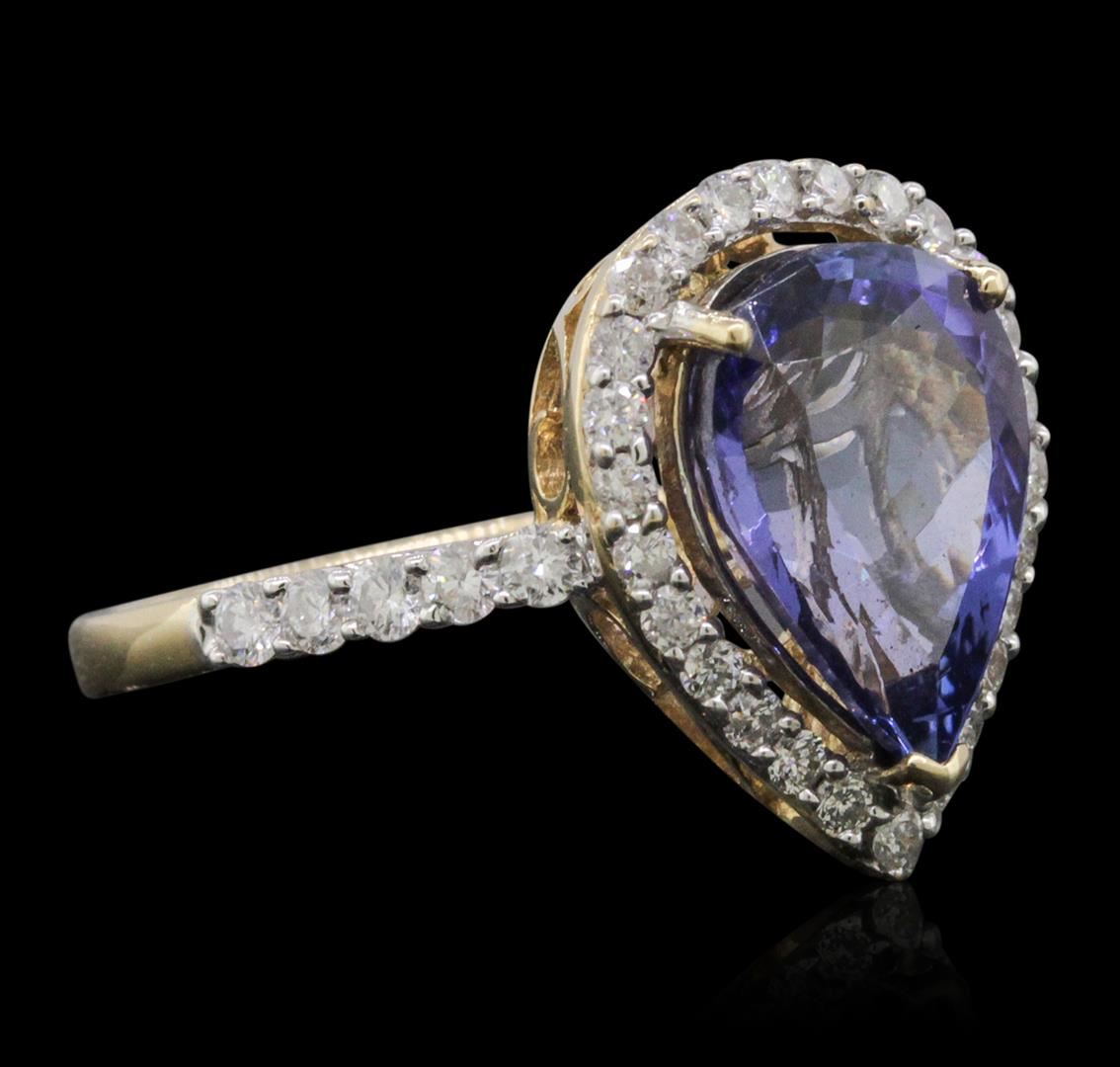 One electronically tested 14KT yellow gold ladies combination cast & assembled tanzanite and diamond ring with a flat shank with a bright polish finish. Identified with markings of "14K". Condition is new. Containing: One prong set pear modified brilliant cut natural tanzanite, measuring 11.00 x 8.70 x 4.36mm, approximate weight of 2.80ct., clarity is eye clean, type I, medium, very slightly grayish, violet color, (GIA V 5/3), cut is good. Thirty-Six prong set round brilliant cut diamonds, measuring 1.80 - 1.50 x 0.99mm (depth est.) approximate total weight of 36 Stones = 0.50ct. Clarity: SI-2 to I-2. Color: I - J, Cut is Good. Colored gemstones are presumed to have been subjected to commonly used enhancement processes. All diamonds and colored gemstones are graded in the mounting, unless otherwise stated. Total Weight of Colored Stones 2.80ct. Total Weight of Diamonds 0.50ct. Total Weight of Ring 3.80 grams. GGL Appraised at $6,075.00.