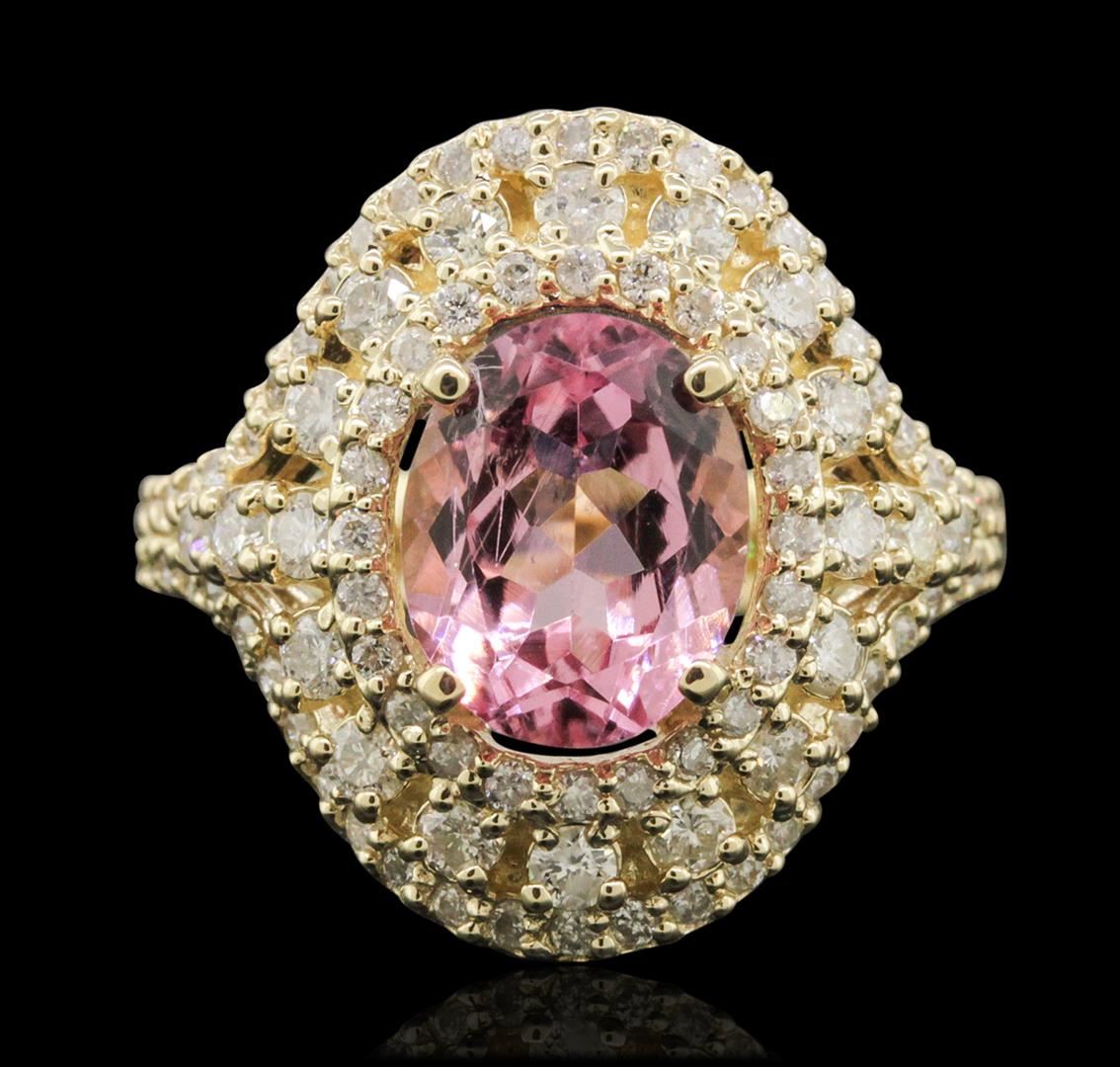 One electronically tested 14KT yellow gold ladies combination cast & assembled ring with a bright polish finish. Condition is new. Identified with markings of "K14". Containing: One prong set oval modified brilliant cut natural kunzite, measuring 10.00 x 8.00 x 5.45mm, approximate weight of 2.81ct., clarity is eye clean, type I, light, very slightly grayish, reddish purple color, (GIA rP 3/3), cut is good. Twenty-Four prong set round brilliant cut diamonds, measuring 1.10 - 1.10 x 0.66mm (depth est.) approximate. Total Weight of 24 Stones = 0.12ct. Clarity: I-1 to I-2. Color: I - J, Cut is Good. Seventy-Six prong set round brilliant cut diamonds, measuring 2.20 - 1.30 x 1.05mm (depth est.) approximate. Total Weight of 76 Stones = 0.99ct. Clarity: I-1 to I-2. Color: I - J, Cut is Good. Colored gemstones are presumed to have been subjected to commonly used enhancement processes. All diamonds and colored gemstones are graded in the mounting, unless otherwise stated. Total Weight of Colored Stones 2.81ct. Total Weight of Diamonds 1.11ct. Total Weight of Ring 7.70 grams. GGL Appraised at $6,610.00.