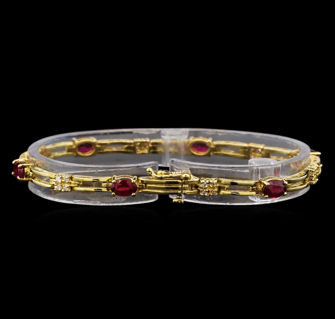 One electronically tested 14KT yellow gold ladies cast ruby and diamond bracelet with a hidden box clasp with safety closer with a bright polish finish. Measurements: 6.50" in length Identified with markings of "14K". Condition is new. Containing: Six prong set oval modified brilliant cut natural rubies, measuring 6.00. x 3.80 x 2.47mm, approximate total weight of 2.82ct., clarity is moderately included, type II, medium dark, moderately strong, red color, (GIA R 6/4), cut is good. Twenty-Four prong set round brilliant cut diamonds, measuring 1.30 - 1.30 x 0.78mm (depth est.) approximate total weight of 24 Stones = 0.19ct. Clarity: SI-1 to SI-2. Color: I - J, Cut is Good. Colored gemstones are presumed to have been subjected to commonly used enhancement processes. All diamonds and colored gemstones are graded in the mounting, unless otherwise stated. Total Weight of Colored Stones 2.82ct. Total Weight of Diamonds 0.19ct. Total Weight of Bracelet 9.80 grams. GGL Appraised at $2,420.00.