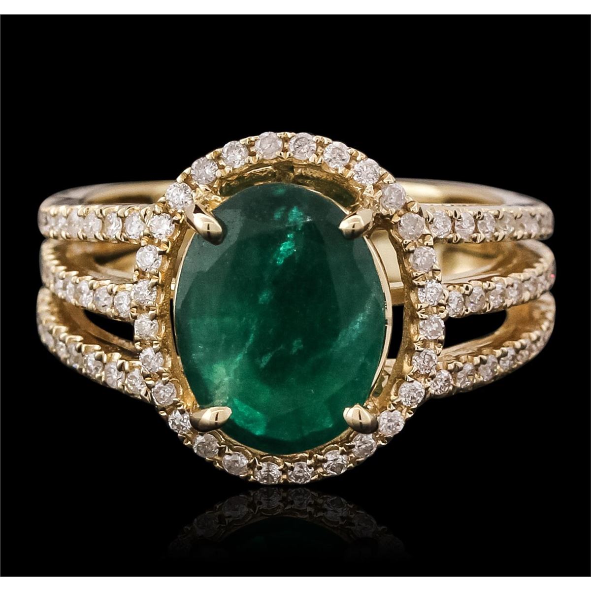 One electronically tested 14KT yellow gold ladies combination cast & assembled emerald and diamond ring with a split shank with a bright polish finish. Identified with markings of "14K". Condition is new. Containing: One prong set oval modified brilliant cut natural emerald, measuring 10.98 x 8.36 x 5.54mm, approximate weight of 2.82ct., clarity is heavily included, type III, medium dark, moderately strong, green color, (GIA G 6/4), cut is good. One Hundred Five prong set round brilliant cut diamonds, measuring 1.20 - 1.20 x 0.72mm (depth est.) approximate total weight of 105 Stones = 0.66ct. Clarity: I-1 to I-2. Color: J - K, Cut is Good. Colored gemstones are presumed to have been subjected to commonly used enhancement processes. All diamonds and colored gemstones are graded in the mounting, unless otherwise stated total weight of Colored Stones 2.82ct. Total Weight of Diamonds 0.66ct. Total Weight of Ring 5.30 grams. GGL Appraised at $8,590.00.