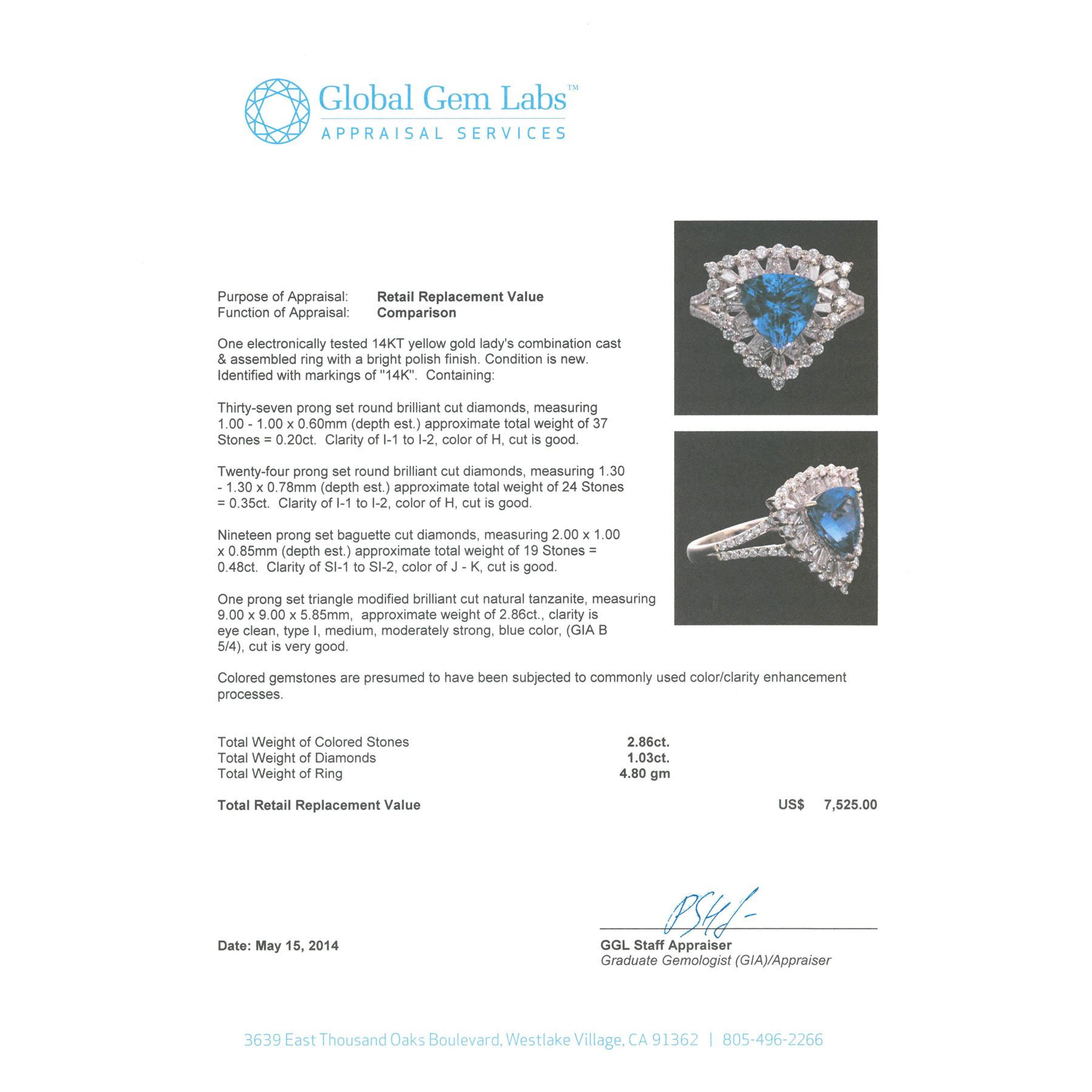 One electronically tested 14KT yellow gold Ladies combination cast & assembled ring with a bright polish finish. Identified with markings of "14K". Condition is new. Containing: Thirty-Seven prong set round brilliant cut diamonds, measuring 1.00 - 1.00 x 0.60mm (depth est.) approximate total weight of 37 Stones = 0.20ct. Clarity of I-1 to I-2, Color of H, Cut is Good. Twenty-Four prong set round brilliant cut diamonds, measuring 1.30 - 1.30 x 0.78mm (depth est.) approximate total weight of 24 Stones = 0.35ct. Clarity of I-1 to I-2, Color of H, Cut is Good. Nineteen prong set baguette cut diamonds, measuring 2.00 x 1.00 x 0.85mm (depth est.) approximate total weight of 19 Stones = 0.48ct. Clarity of SI-1 to SI-2, Color of J - K, Cut is Good. One prong set triangle modified brilliant cut natural tanzanite, measuring 9.00 x 9.00 x 5.85mm, approximate weight of 2.86ct., clarity is eye clean, type I, medium, moderately strong, blue color, (GIA B 5/4), cut is very good. Colored gemstones are presumed to have been subjected to commonly used color/clarity enhancement processes. Total Weight of Colored Stones 2.86ct. Total Weight of Diamonds 1.03ct. Total Weight of Ring 4.80 grams. GGL Appraised at $7,525.00.