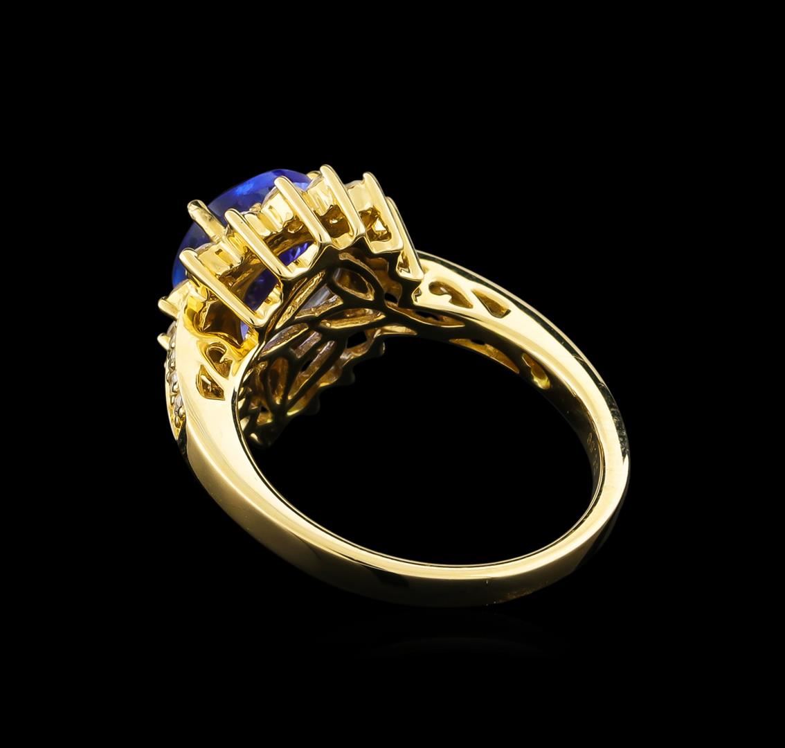 One electronically tested 14KT yellow gold ladies combination cast & assembled tanzanite and diamond ring with a flat shank with a bright polish finish. Identified with markings of "14K". Condition is new. Containing: One prong set pear modified brilliant cut natural tanzanite, measuring 10.50 x 7.91 x 5.14mm, approximate weight of 2.86ct., clarity is eye clean, type I, medium, very slightly grayish, violet color, (GIA V 5/3), cut is good. Fifteen prong set round brilliant cut diamonds, measuring 1.80 - 1.80 x 1.08mm (depth est.) approximate total weight of 15 Stones = 0.32ct. Clarity: I-1 to I-2. Color: J, Cut is Good. Eight prong set round brilliant cut diamonds, measuring 1.00 - 1.00 x 0.60mm (depth est.) approximate total weight of 8 Stones = 0.03ct. Clarity: I-1 to I-2. Color: J, Cut is Good. Colored gemstones are presumed to have been subjected to commonly used enhancement processes. All diamonds and colored gemstones are graded in the mounting, unless otherwise stated. Total Weight of Colored Stones 2.86ct. Total Weight of Diamonds 0.35ct. Total Weight of Ring 5.70 grams. GGL Appraised.