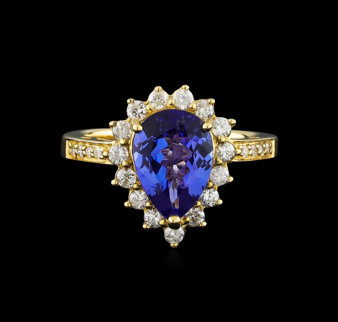 One electronically tested 14KT yellow gold ladies combination cast & assembled tanzanite and diamond ring with a flat shank with a bright polish finish. Identified with markings of "14K". Condition is new. Containing: One prong set pear modified brilliant cut natural tanzanite, measuring 10.50 x 7.91 x 5.14mm, approximate weight of 2.86ct., clarity is eye clean, type I, medium, very slightly grayish, violet color, (GIA V 5/3), cut is good. Fifteen prong set round brilliant cut diamonds, measuring 1.80 - 1.80 x 1.08mm (depth est.) approximate total weight of 15 Stones = 0.32ct. Clarity: I-1 to I-2. Color: J, Cut is Good. Eight prong set round brilliant cut diamonds, measuring 1.00 - 1.00 x 0.60mm (depth est.) approximate total weight of 8 Stones = 0.03ct. Clarity: I-1 to I-2. Color: J, Cut is Good. Colored gemstones are presumed to have been subjected to commonly used enhancement processes. All diamonds and colored gemstones are graded in the mounting, unless otherwise stated. Total Weight of Colored Stones 2.86ct. Total Weight of Diamonds 0.35ct. Total Weight of Ring 5.70 grams. GGL Appraised.