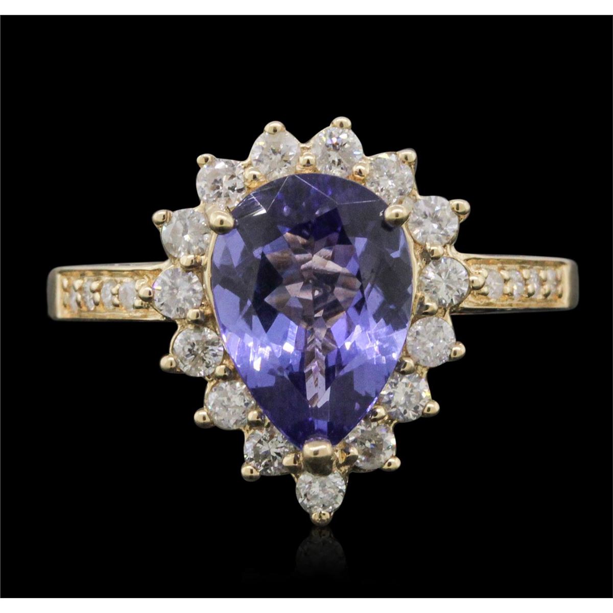 One electronically tested 14KT yellow gold ladies combination cast & assembled tanzanite and diamond ring with a flat shank with a bright polish finish. Identified with markings of "14K". Condition is new. Containing: One prong set pear modified brilliant cut natural tanzanite, measuring 10.50 x 7.91 x 5.14mm, approximate weight of 2.86ct., clarity is eye clean, type I, medium, very slightly grayish, violet color, (GIA V 5/3), cut is good. Fifteen prong set round brilliant cut diamonds, measuring 1.80 - 1.80 x 1.08mm (depth est.) approximate total weight of 15 Stones = 0.32ct. Clarity: I-1 to I-2. Color: J, Cut is Good. Eight prong set round brilliant cut diamonds, measuring 1.00 - 1.00 x 0.60mm (depth est.) approximate total weight of 8 Stones = 0.03ct. Clarity: I-1 to I-2. Color: J, Cut is Good. Colored gemstones are presumed to have been subjected to commonly used enhancement processes. All diamonds and colored gemstones are graded in the mounting, unless otherwise stated. Total Weight of Colored Stones 2.86ct. Total Weight of Diamonds 0.35ct. Total Weight of Ring 5.70 grams. GGL Appraised at $7,195.00.