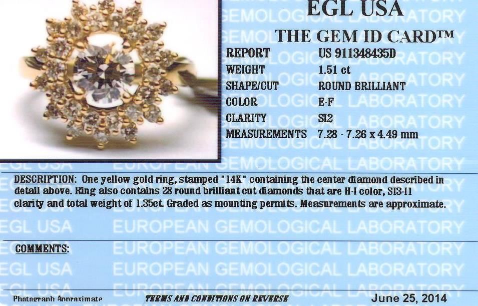 One electronically tested 14KT yellow gold Ladies combination cast & assembled engagement ring with a bright polish finish. Condition is new. Identified with markings of "14K". Containing: One prong set round brilliant cut diamond, measuring 7.28 - 7.26 x 4.49mm (depth est.) approximate. Total Weight of 1.51ct. Clarity: SI-2. Color: E, Cut is Good. Twenty-Eight prong set round brilliant cut diamonds, measuring 2.40 - 2.40 x 1.44mm (depth est.) approximate. Total Weight of 28 Stones = 1.35ct. Clarity: SI-3 to I-1. Color: H - I, Cut is Good. EGL USA GEM ID# US 911348435D. All diamonds are graded in the mounting, unless otherwise stated. Total Weight of Diamonds 2.86ct. Total Weight of Engagement Ring 6.30 grams. GGL Appraised at $51,795.00.