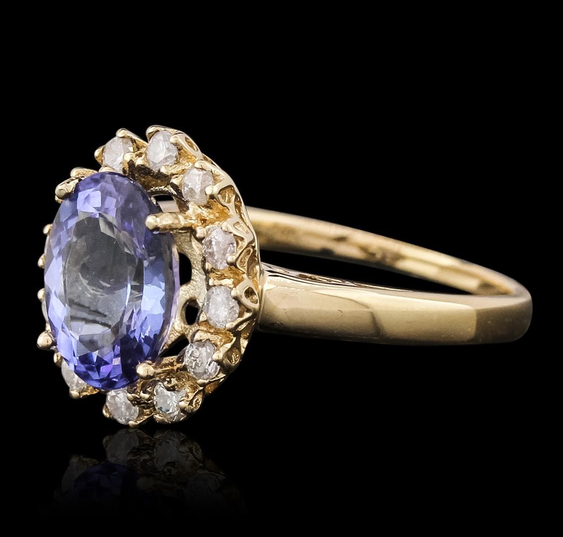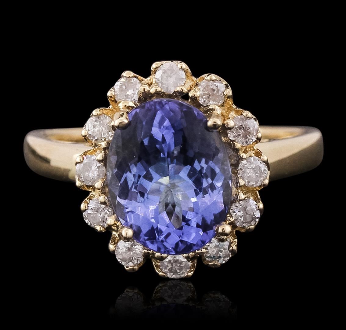 One electronically tested 14KT yellow gold ladies combination cast & assembled tanzanite and diamond ring with a flat shank with a bright polish finish. Identified with markings of "14K". Condition is new. Containing: One prong set oval modified brilliant cut natural tanzanite, measuring 10.00 x 8.14 x 5.29mm, approximate weight of 2.92ct., clarity is eye clean, type I, medium light, very slightly grayish, violet color, (GIA V 4/3), cut is good. Twelve prong set round brilliant cut diamonds, measuring 1.90 - 1.90 x 1.14mm (depth est.) approximate total weight of 12 Stones = 0.30ct. Clarity: SI-2 to I-2. Color: J - K, Cut is Good. Colored gemstones are presumed to have been subjected to commonly used enhancement processes. All diamonds and colored gemstones are graded in the mounting, unless otherwise stated. Total Weight of Colored Stones 2.92ct. Total Weight of Diamonds 0.30ct. Total Weight of Ring 3.80 grams. GGL Appraised at $5,960.00.