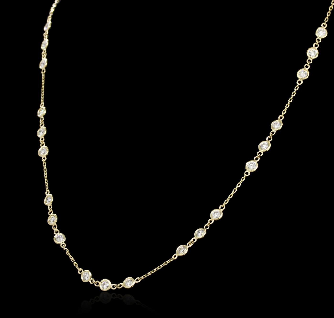 One electronically tested 14KT yellow gold ladies cast diamond necklace with a lobster claw clasp with a bright polish finish. Measurements: 16" in length Identified with markings of "K14". Condition is new. Containing: Thirty bezel set round brilliant cut diamonds, measuring 3.00 - 3.00 x 1.80mm (depth est.) approximate total weight of 30 Stones = 2.96ct. Clarity: SI-1 to SI-2. Color: I - J, Cut is Good. All diamonds are graded in the mounting, unless otherwise stated. Total Weight of Diamonds 2.96ct. Total Weight of Necklace 5.70 grams. GGL Appraised at $7,325.00.