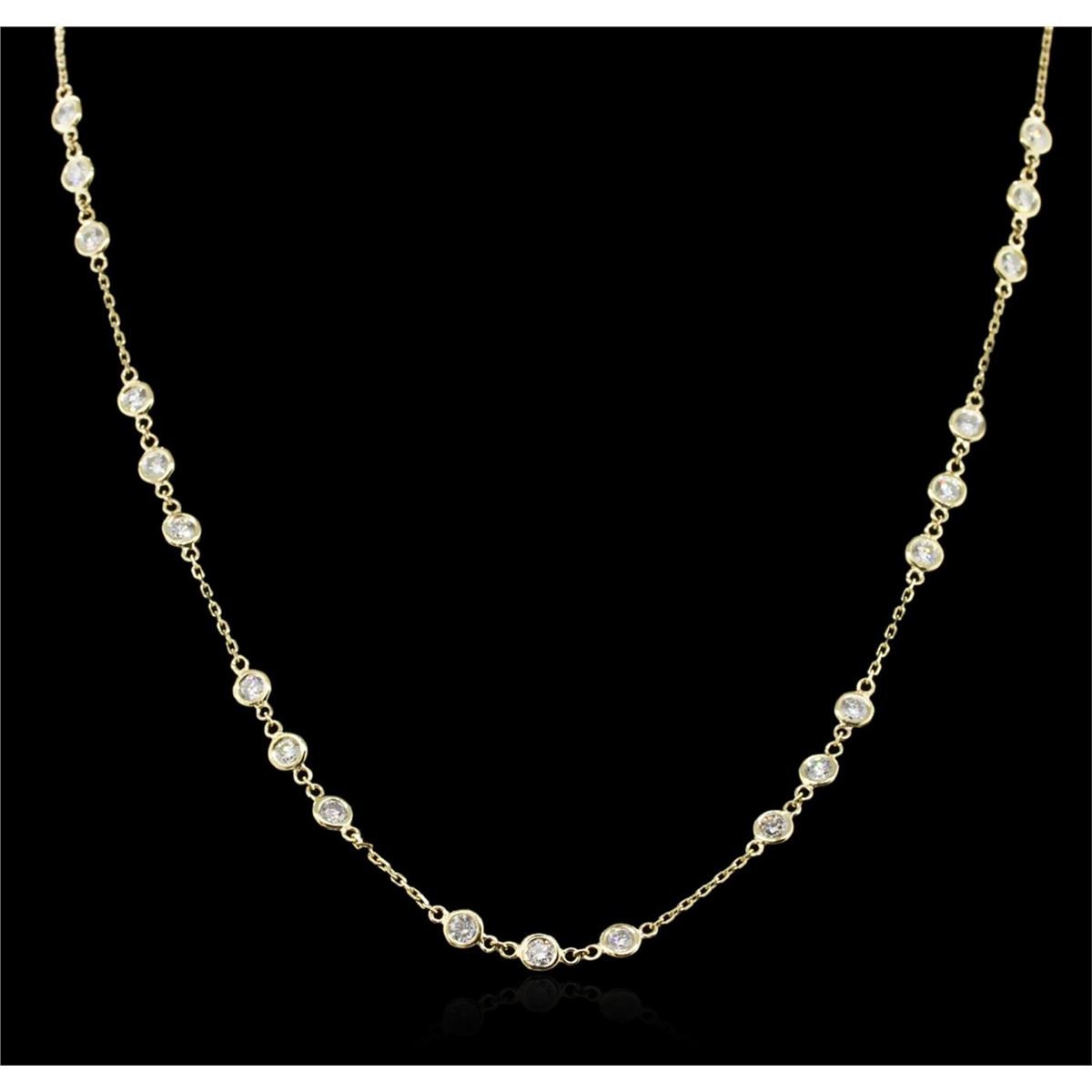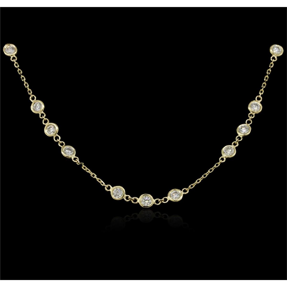 One electronically tested 14KT yellow gold ladies cast diamond necklace with a lobster claw clasp with a bright polish finish. Measurements: 16" in length Identified with markings of "K14". Condition is new. Containing: Thirty bezel set round brilliant cut diamonds, measuring 3.00 - 3.00 x 1.80mm (depth est.) approximate total weight of 30 Stones = 2.96ct. Clarity: SI-1 to SI-2. Color: I - J, Cut is Good. All diamonds are graded in the mounting, unless otherwise stated. Total Weight of Diamonds 2.96ct. Total Weight of Necklace 5.70 grams. GGL Appraised at $7,325.00.