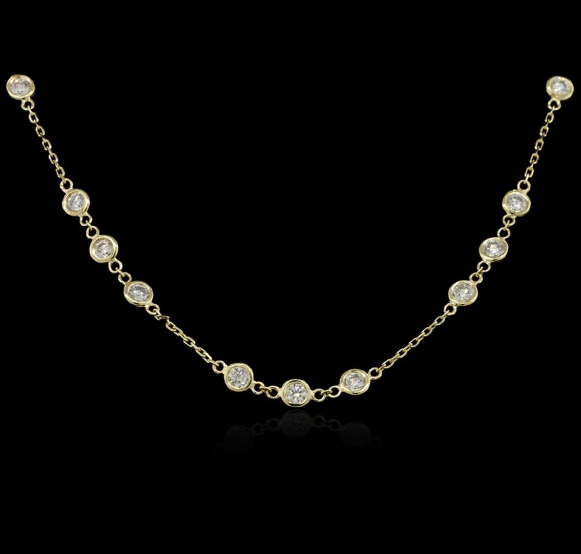 One electronically tested 14KT yellow gold ladies cast diamond necklace with a lobster claw clasp with a bright polish finish. Measurements: 16" in length Identified with markings of "K14". Condition is new. Containing: Thirty bezel set round brilliant cut diamonds, measuring 3.00 - 3.00 x 1.80mm (depth est.) approximate total weight of 30 Stones = 2.96ct. Clarity: SI-1 to SI-2. Color: I - J, Cut is Good. All diamonds are graded in the mounting, unless otherwise stated. Total Weight of Diamonds 2.96ct. Total Weight of Necklace 5.70 grams. GGL Appraised at $7,325.00.