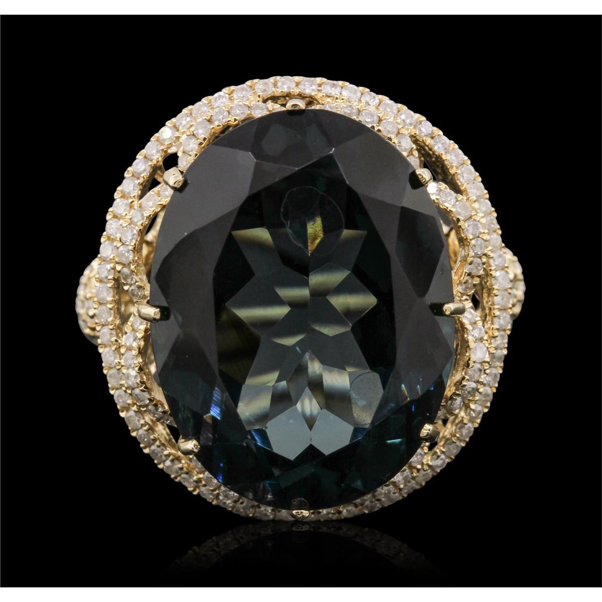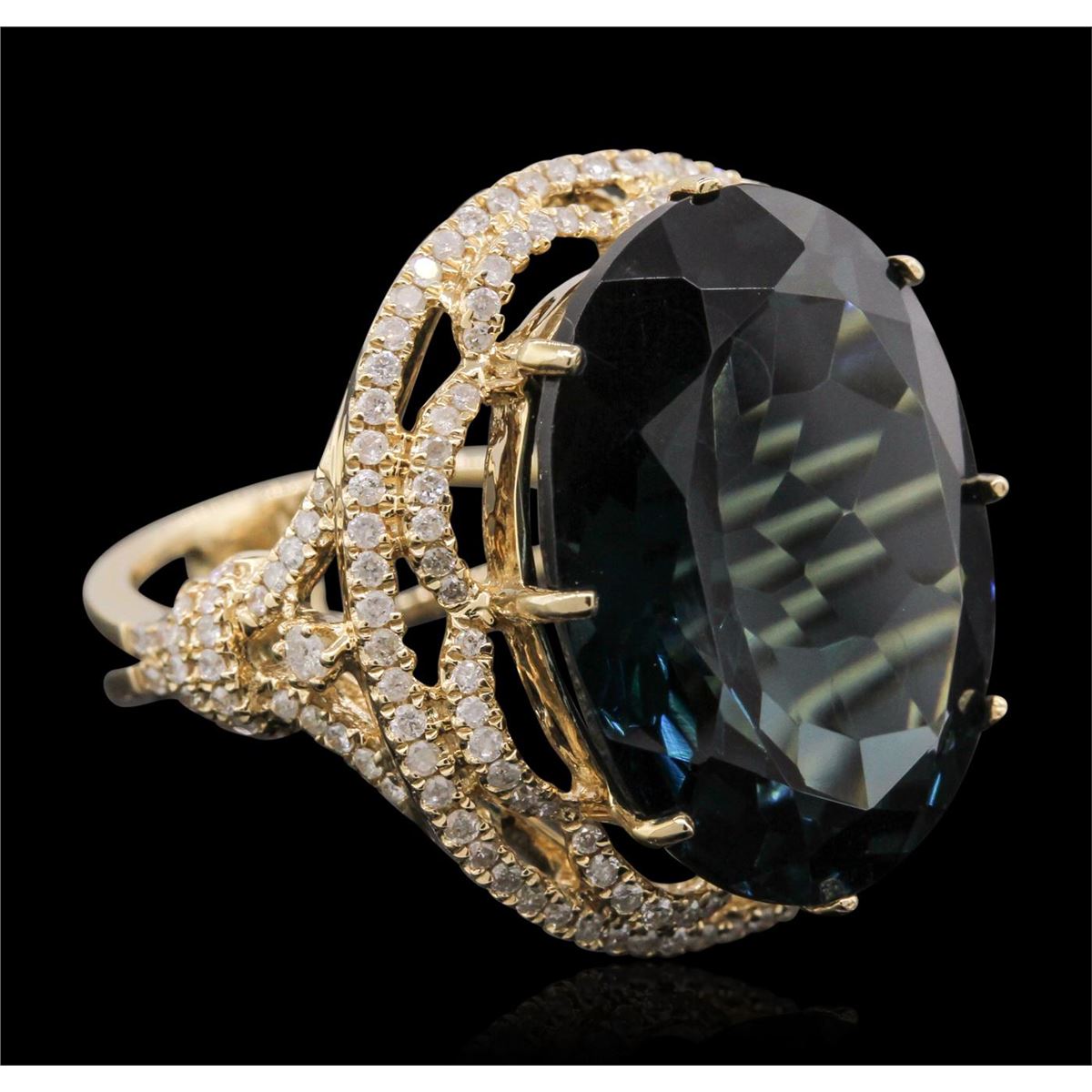 One electronically tested 14KT yellow gold ladies cast topaz and diamond ring with a bright polish finish. The featured topaz is set within a diamond lattice gallery, supported by diamond set split shoulders and completed by a single band split in two, one millimeter wide each. Trademark is Orianne. Identified with markings of "14K". Condition is new, good workmanship. Containing: One prong set oval mixed cut natural blue topaz, measuring 19.70 x 14.00. x 9.00.mm, 8%. bulge factor, approximate weight of 20.72ct., clarity is eye clean, type I, dark, very slightly grayish, very slightly greenish blue color, (GIA vslgB 7/3), cut is good. Transmitting light with no distortion, transparent. Graded in the setting.A deposit of a thin layer has been applied to the topaz to produce the intense color effect. The process utilizes a very high temperature treatment, diffusion of ions into the topaz, plus in some cases neutron bombardment has been used to create the color center. Diffusion processes causes the added ions to become part of the crystal surface with no distinct boundary. Do not put a gem treated in this manner into an ultrasonic cleaner. One Hundred Seventy-Three prong set round brilliant cut diamonds, measuring 1.70 - 0.90 x 0.78mm (depth est.) approximate. Total Weight of 173 Stones = 0.67ct. Graded in the setting. Clarity: I-2 to I-3 . Color: G - I. Total Weight of Colored Stones 20.72ct. Total Weight of Diamonds 0.67ct. Total Weight of Ring 10.30gm. AIG Appraised at $4,050.00.