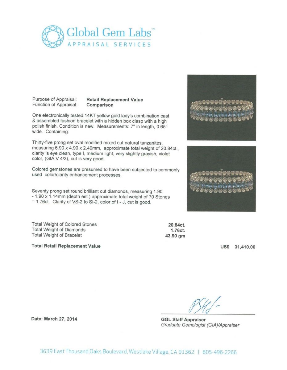 One electronically tested 14KT yellow gold Ladies combination cast & assembled fashion bracelet with a hidden box clasp with a high polish finish. Condition is new. Measurements: 7" in length, 0.65" wide. Containing: Thirty-five prong set oval modified mixed cut natural tanzanites, measuring 6.90 x 4.90 x 2.40mm, approximate. Total Weight of 20.84ct., clarity is eye clean, type I, medium light, very slightly grayish, violet color, (GIA V 4/3), cut is very good. Colored gemstones are presumed to have been subjected to commonly used color/clarity enhancement processes. Seventy prong set round brilliant cut diamonds, measuring 1.90 - 1.90 x 1.14mm (depth est.) approximate. Total Weight of 70 Stones = 1.76ct. Clarity: VS-2 to SI-2. Color: I - J, Cut is Good. Total Weight of Colored Stones 20.84ct. Total Weight of Diamonds 1.76ct. Total Weight of Bracelet 43.90 grams. GGL Appraised at $31,410.00.