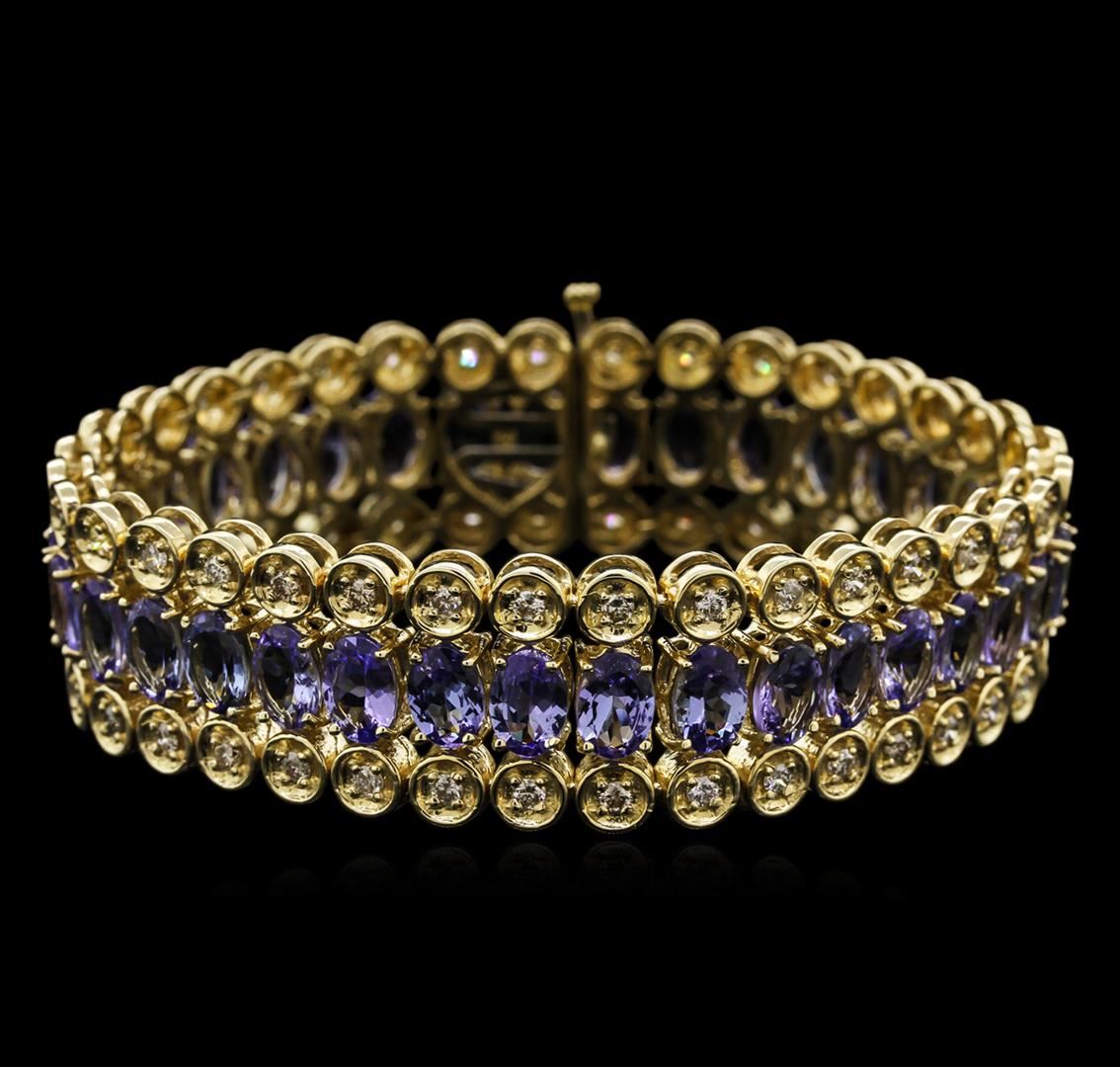 One electronically tested 14KT yellow gold Ladies combination cast & assembled fashion bracelet with a hidden box clasp with a high polish finish. Condition is new. Measurements: 7" in length, 0.65" wide. Containing: Thirty-five prong set oval modified mixed cut natural tanzanites, measuring 6.90 x 4.90 x 2.40mm, approximate. Total Weight of 20.84ct., clarity is eye clean, type I, medium light, very slightly grayish, violet color, (GIA V 4/3), cut is very good. Colored gemstones are presumed to have been subjected to commonly used color/clarity enhancement processes. Seventy prong set round brilliant cut diamonds, measuring 1.90 - 1.90 x 1.14mm (depth est.) approximate. Total Weight of 70 Stones = 1.76ct. Clarity: VS-2 to SI-2. Color: I - J, Cut is Good. Total Weight of Colored Stones 20.84ct. Total Weight of Diamonds 1.76ct. Total Weight of Bracelet 43.90 grams. GGL Appraised at $31,410.00.