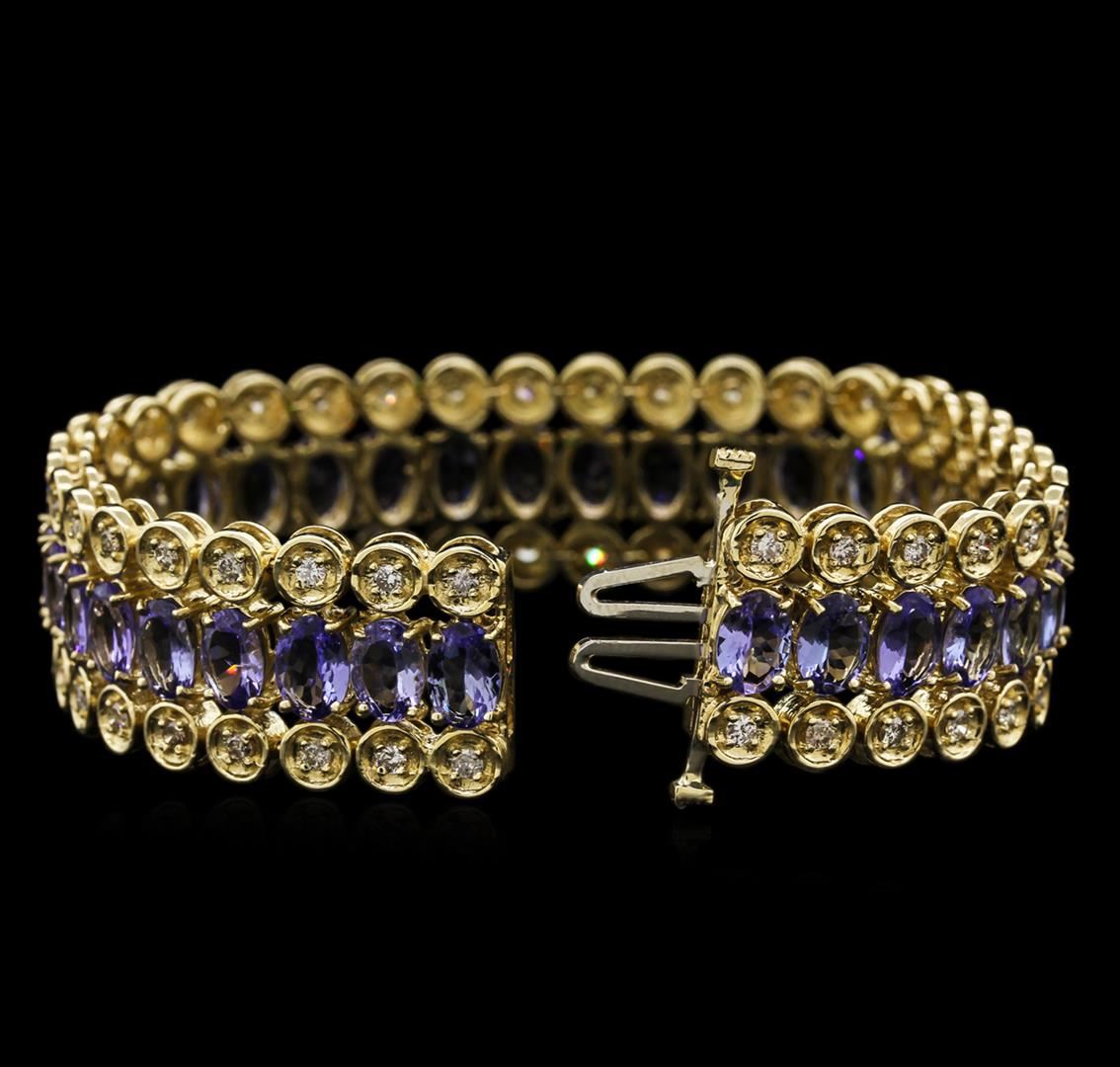 One electronically tested 14KT yellow gold Ladies combination cast & assembled fashion bracelet with a hidden box clasp with a high polish finish. Condition is new. Measurements: 7" in length, 0.65" wide. Containing: Thirty-five prong set oval modified mixed cut natural tanzanites, measuring 6.90 x 4.90 x 2.40mm, approximate. Total Weight of 20.84ct., clarity is eye clean, type I, medium light, very slightly grayish, violet color, (GIA V 4/3), cut is very good. Colored gemstones are presumed to have been subjected to commonly used color/clarity enhancement processes. Seventy prong set round brilliant cut diamonds, measuring 1.90 - 1.90 x 1.14mm (depth est.) approximate. Total Weight of 70 Stones = 1.76ct. Clarity: VS-2 to SI-2. Color: I - J, Cut is Good. Total Weight of Colored Stones 20.84ct. Total Weight of Diamonds 1.76ct. Total Weight of Bracelet 43.90 grams. GGL Appraised at $31,410.00.