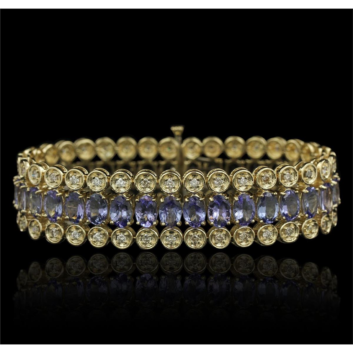 One electronically tested 14KT yellow gold Ladies combination cast & assembled fashion bracelet with a hidden box clasp with a high polish finish. Condition is new. Measurements: 7" in length, 0.65" wide. Containing: Thirty-five prong set oval modified mixed cut natural tanzanites, measuring 6.90 x 4.90 x 2.40mm, approximate. Total Weight of 20.84ct., clarity is eye clean, type I, medium light, very slightly grayish, violet color, (GIA V 4/3), cut is very good. Colored gemstones are presumed to have been subjected to commonly used color/clarity enhancement processes. Seventy prong set round brilliant cut diamonds, measuring 1.90 - 1.90 x 1.14mm (depth est.) approximate. Total Weight of 70 Stones = 1.76ct. Clarity: VS-2 to SI-2. Color: I - J, Cut is Good. Total Weight of Colored Stones 20.84ct. Total Weight of Diamonds 1.76ct. Total Weight of Bracelet 43.90 grams. GGL Appraised at $31,410.00.