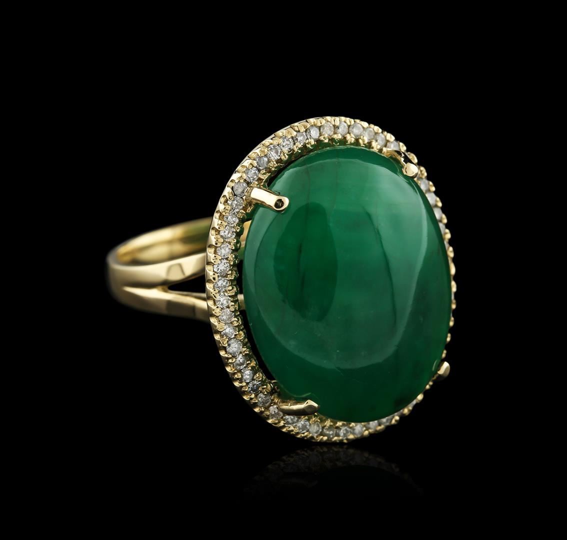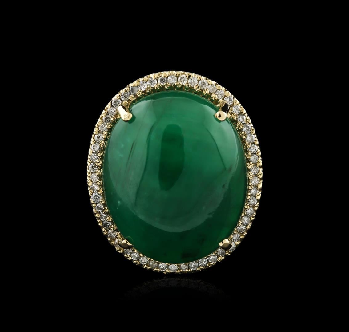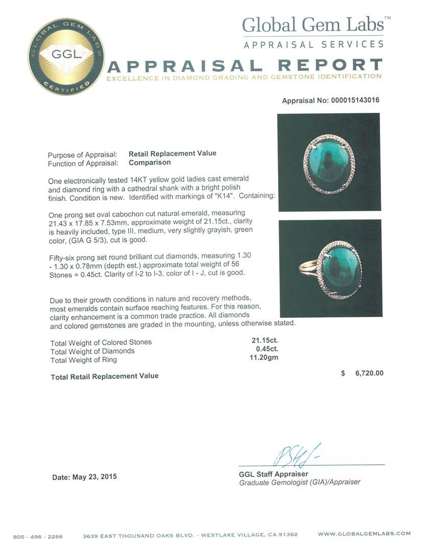 One electronically tested 14KT yellow gold ladies cast emerald and diamond ring with a cathedral shank with a bright polish finish. Identified with markings of "K14". Condition is new. Containing: One prong set oval cabochon cut natural emerald, measuring 21.43 x 17.85 x 7.53mm, approximate weight of 21.15ct., clarity is heavily included, type III, medium, very slightly grayish, green color, (GIA G 5/3), cut is good. Fifty-Six prong set round brilliant cut diamonds, measuring 1.30 - 1.30 x 0.78mm (depth est.) approximate total weight of 56 Stones = 0.45ct. Clarity: I-2 to I-3. Color: I - J, Cut is Good. Due to their growth conditions in nature and recovery methods, most emeralds contain surface reaching features. For this reason, clarity enhancement is a common trade practice. All diamonds and colored gemstones are graded in the mounting, unless otherwise stated. Total Weight of Colored Stones 21.15ct. Total Weight of Diamonds 0.45ct. Total Weight of Ring 11.20 grams. GGL Appraised at $6,720.00.