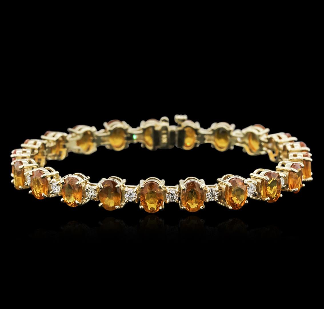 One electronically tested 14KT yellow gold ladies cast sapphire and diamond bracelet with a hidden box clasp with safety closer with a bright polish finish. Measurements: 7 inches in length. Identified with markings of "14K". Condition is new. Containing: Twenty-one prong set oval modified brilliant cut natural yellow sapphires, measuring 6.80 x 5.00. x 3.25mm, approximate total weight of 21.40ct., clarity is eye clean, medium light, brownish, yellow color, (GIA Y 4/3), cut is good. Twenty-One prong set round brilliant cut diamonds, measuring 2.50 - 2.50 x 1.50mm (depth est.) approximate total weight of 21 Stones = 1.20ct. Clarity: VS-2 to SI-1. Color: J, Cut is Good. Colored gemstones are presumed to have been subjected to commonly used enhancement processes. All diamonds and colored gemstones are graded in the mounting, unless otherwise stated. Total Weight of Colored Stones 21.40ct. Total Weight of Diamonds 1.20ct. Total Weight of Bracelet 19.60 grams. GGL Appraised at $5,570.00.