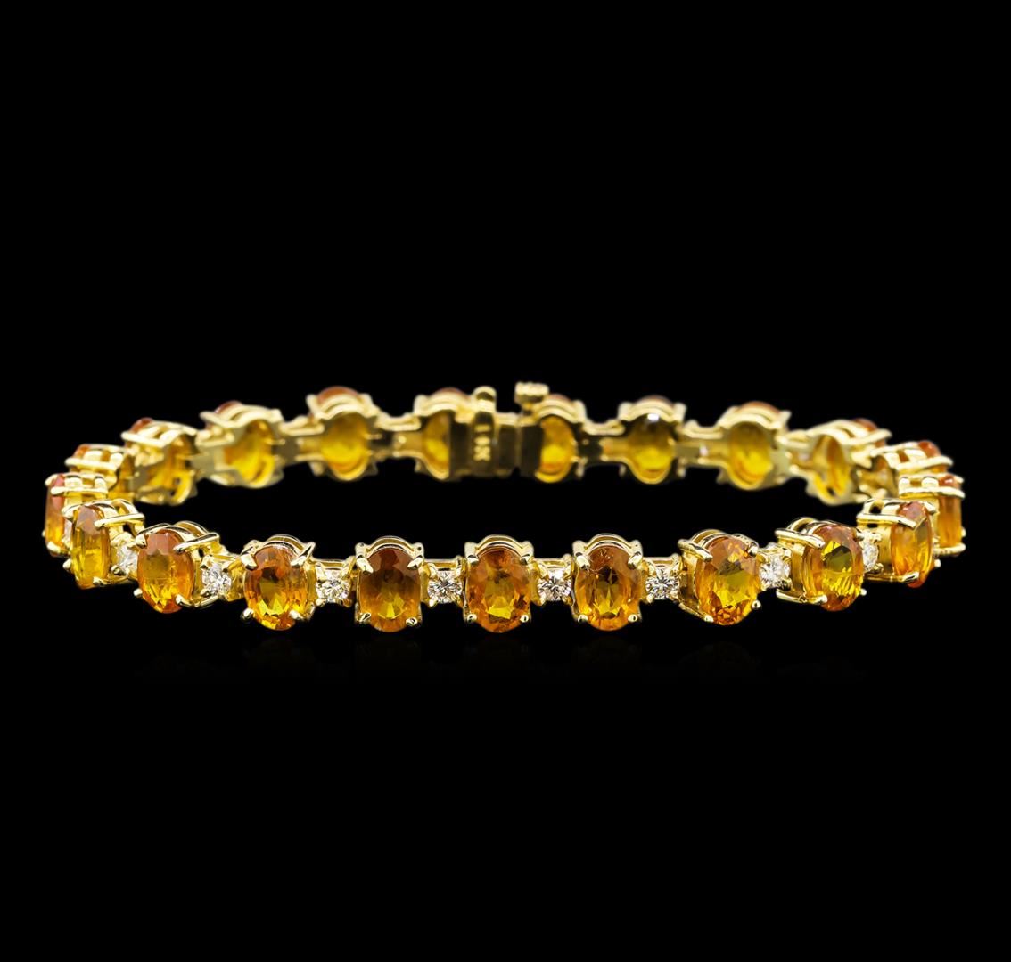 One electronically tested 14KT yellow gold ladies cast sapphire and diamond bracelet with a hidden box clasp with safety closer with a bright polish finish. Measurements: 7 inches in length. Identified with markings of "14K". Condition is new. Containing: Twenty-one prong set oval modified brilliant cut natural yellow sapphires, measuring 6.80 x 5.00. x 3.25mm, approximate total weight of 21.40ct., clarity is eye clean, medium light, brownish, yellow color, (GIA Y 4/3), cut is good. Twenty-One prong set round brilliant cut diamonds, measuring 2.50 - 2.50 x 1.50mm (depth est.) approximate total weight of 21 Stones = 1.20ct. Clarity: VS-2 to SI-1. Color: J, Cut is Good. Colored gemstones are presumed to have been subjected to commonly used enhancement processes. All diamonds and colored gemstones are graded in the mounting, unless otherwise stated. Total Weight of Colored Stones 21.40ct. Total Weight of Diamonds 1.20ct. Total Weight of Bracelet 19.60 grams. GGL Appraised at $5,570.00.