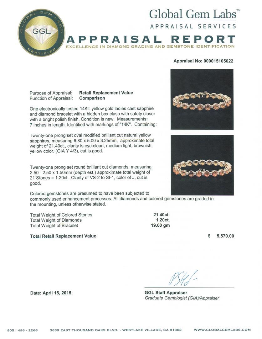 One electronically tested 14KT yellow gold ladies cast sapphire and diamond bracelet with a hidden box clasp with safety closer with a bright polish finish. Measurements: 7 inches in length. Identified with markings of "14K". Condition is new. Containing: Twenty-one prong set oval modified brilliant cut natural yellow sapphires, measuring 6.80 x 5.00. x 3.25mm, approximate total weight of 21.40ct., clarity is eye clean, medium light, brownish, yellow color, (GIA Y 4/3), cut is good. Twenty-One prong set round brilliant cut diamonds, measuring 2.50 - 2.50 x 1.50mm (depth est.) approximate total weight of 21 Stones = 1.20ct. Clarity: VS-2 to SI-1. Color: J, Cut is Good. Colored gemstones are presumed to have been subjected to commonly used enhancement processes. All diamonds and colored gemstones are graded in the mounting, unless otherwise stated. Total Weight of Colored Stones 21.40ct. Total Weight of Diamonds 1.20ct. Total Weight of Bracelet 19.60 grams. GGL Appraised at $5,570.00.