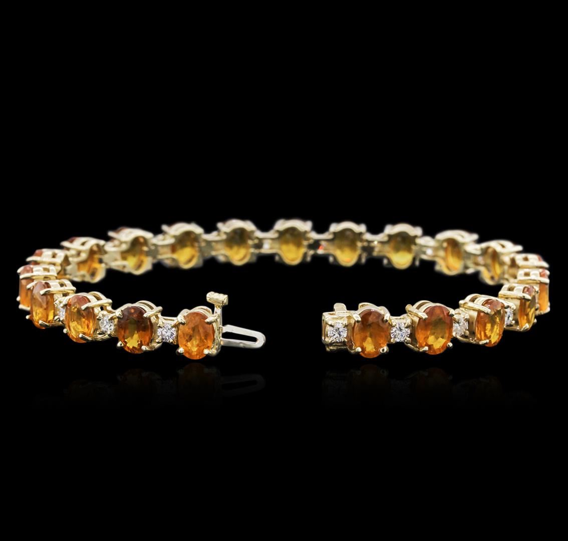 One electronically tested 14KT yellow gold ladies cast sapphire and diamond bracelet with a hidden box clasp with safety closer with a bright polish finish. Measurements: 7 inches in length. Identified with markings of "14K". Condition is new. Containing: Twenty-one prong set oval modified brilliant cut natural yellow sapphires, measuring 6.80 x 5.00. x 3.25mm, approximate total weight of 21.40ct., clarity is eye clean, medium light, brownish, yellow color, (GIA Y 4/3), cut is good. Twenty-One prong set round brilliant cut diamonds, measuring 2.50 - 2.50 x 1.50mm (depth est.) approximate total weight of 21 Stones = 1.20ct. Clarity: VS-2 to SI-1. Color: J, Cut is Good. Colored gemstones are presumed to have been subjected to commonly used enhancement processes. All diamonds and colored gemstones are graded in the mounting, unless otherwise stated. Total Weight of Colored Stones 21.40ct. Total Weight of Diamonds 1.20ct. Total Weight of Bracelet 19.60 grams. GGL Appraised at $5,570.00.