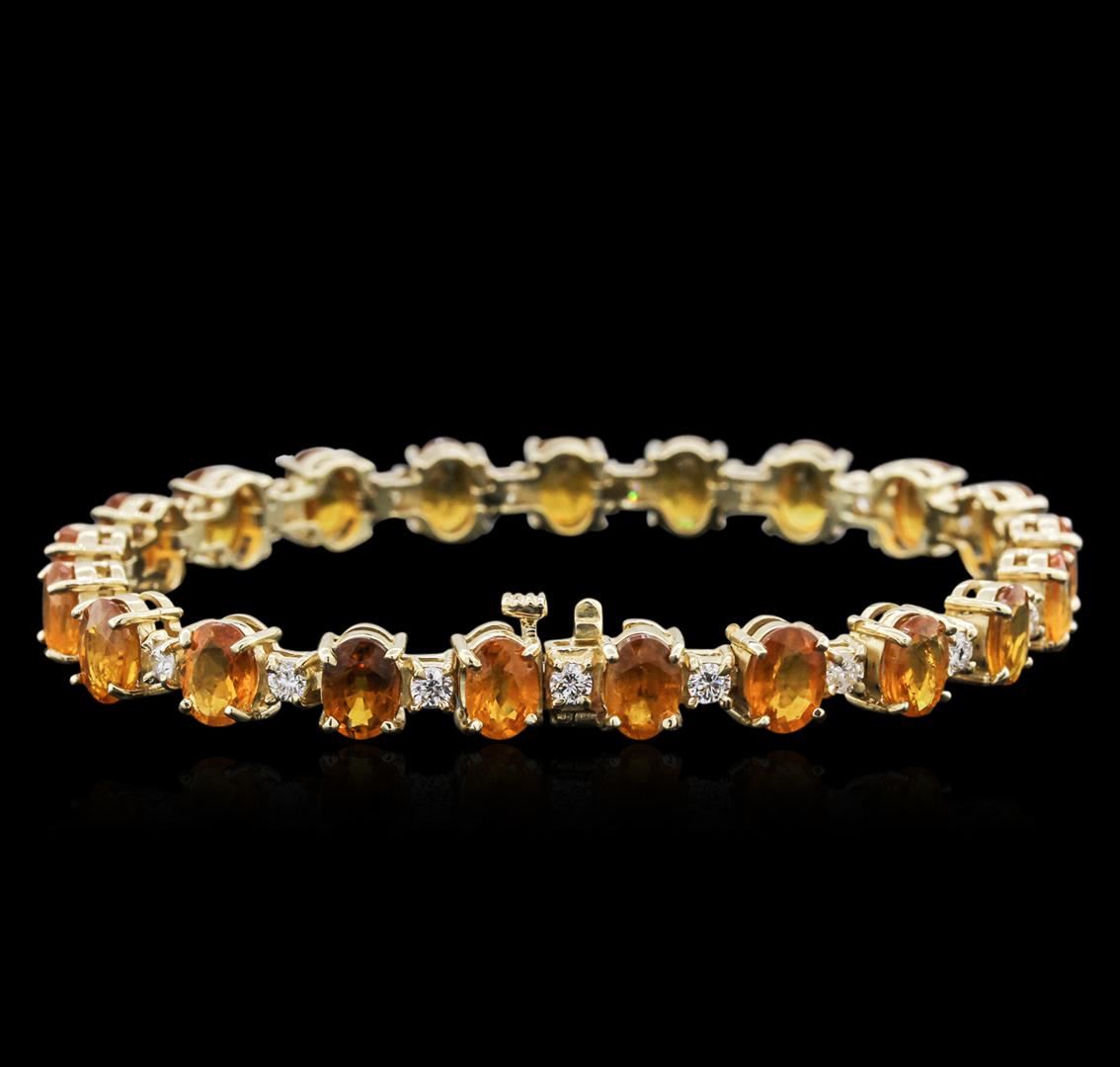 One electronically tested 14KT yellow gold ladies cast sapphire and diamond bracelet with a hidden box clasp with safety closer with a bright polish finish. Measurements: 7 inches in length. Identified with markings of "14K". Condition is new. Containing: Twenty-one prong set oval modified brilliant cut natural yellow sapphires, measuring 6.80 x 5.00. x 3.25mm, approximate total weight of 21.40ct., clarity is eye clean, medium light, brownish, yellow color, (GIA Y 4/3), cut is good. Twenty-One prong set round brilliant cut diamonds, measuring 2.50 - 2.50 x 1.50mm (depth est.) approximate total weight of 21 Stones = 1.20ct. Clarity: VS-2 to SI-1. Color: J, Cut is Good. Colored gemstones are presumed to have been subjected to commonly used enhancement processes. All diamonds and colored gemstones are graded in the mounting, unless otherwise stated. Total Weight of Colored Stones 21.40ct. Total Weight of Diamonds 1.20ct. Total Weight of Bracelet 19.60 grams. GGL Appraised at $5,570.00.