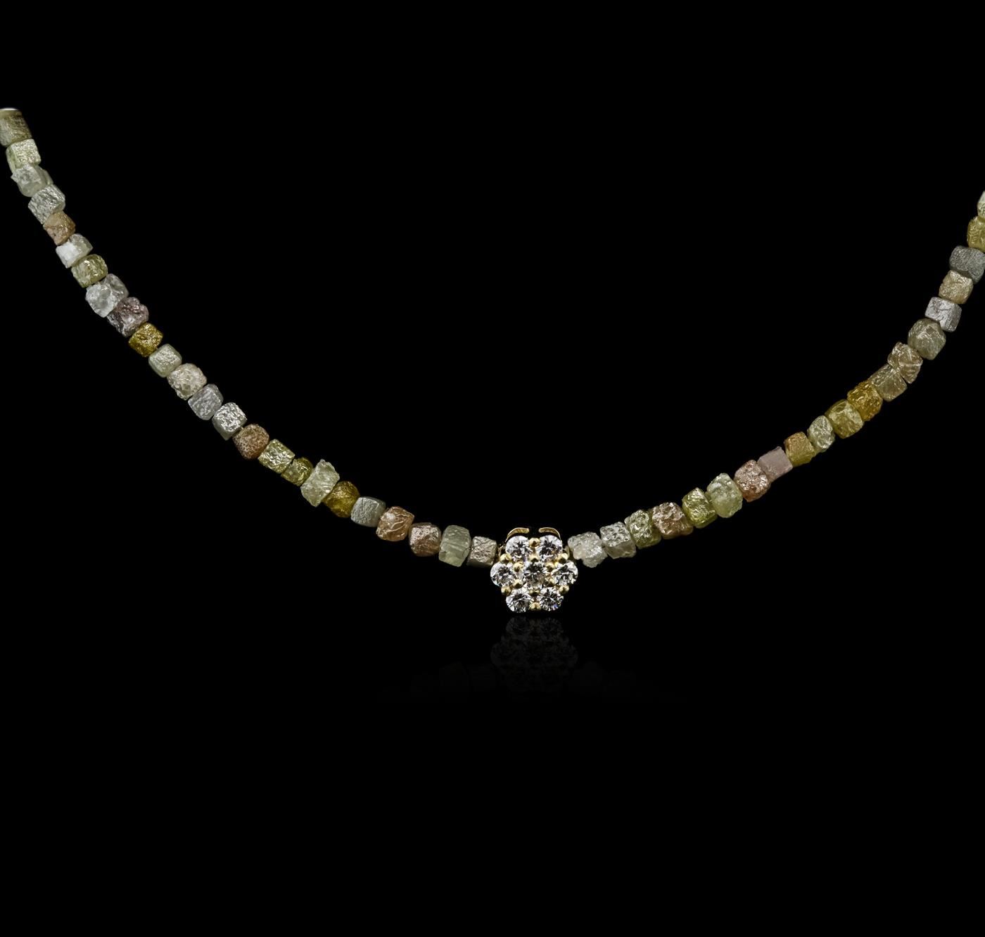 One necklace featuring: 14KT yellow gold weighing 5.20 grams containing rough diamonds with a total weight of 21.46cts and one prong set round cut diamond cluster with a total weight of 0.16cts.